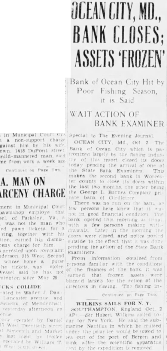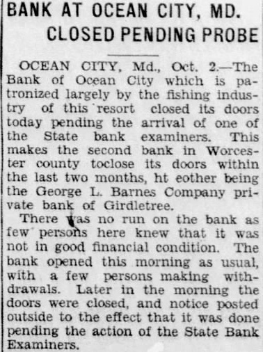 OCEAN CITY, Md., Oct. Bank of Ocean City which tronized largely by the fishing industry of this resort closed its doors today pending the arrival of of the State bank examiners. This makes the second bank in Worcester county toclose its doors within the last two months, ht eother being the George Barnes Company pribank of Girdletree. There no run on the bank few persons here knew that it in good financial condition. The bank opened this morning as usual, with making withdrawals. Later in the morning the doors closed, and posted outside to the effect that was done pending the action of the State Bank Examiners.