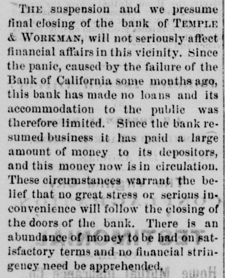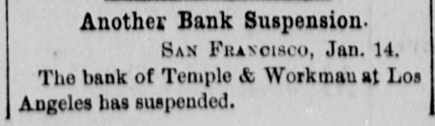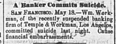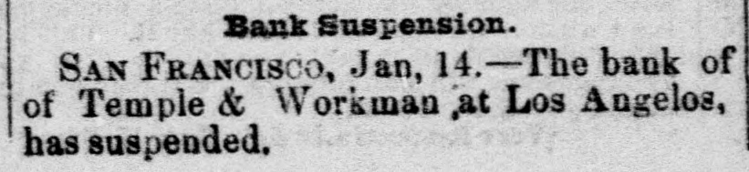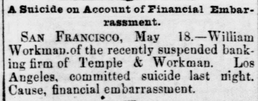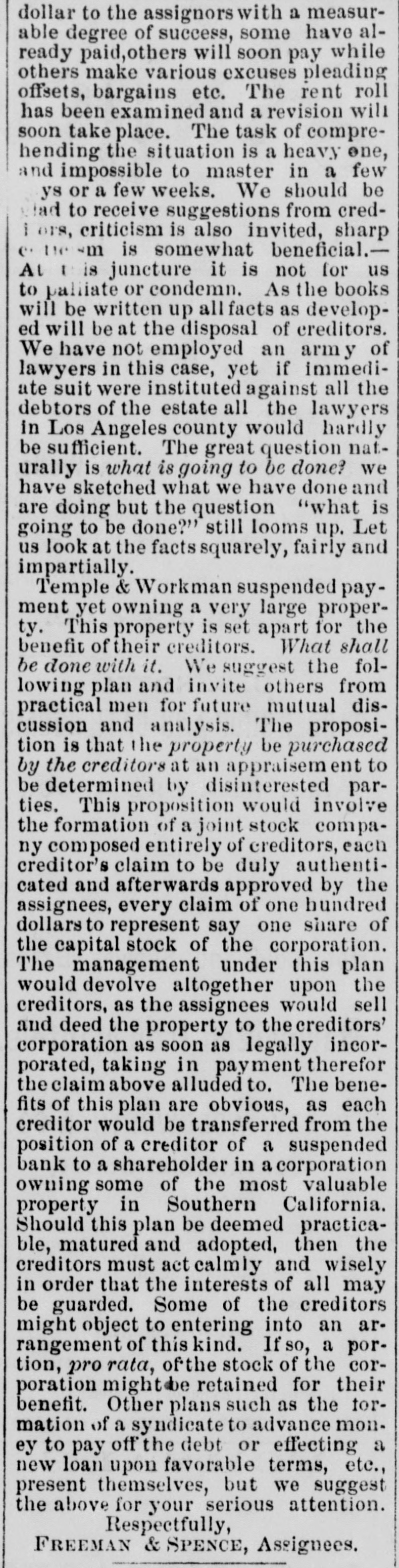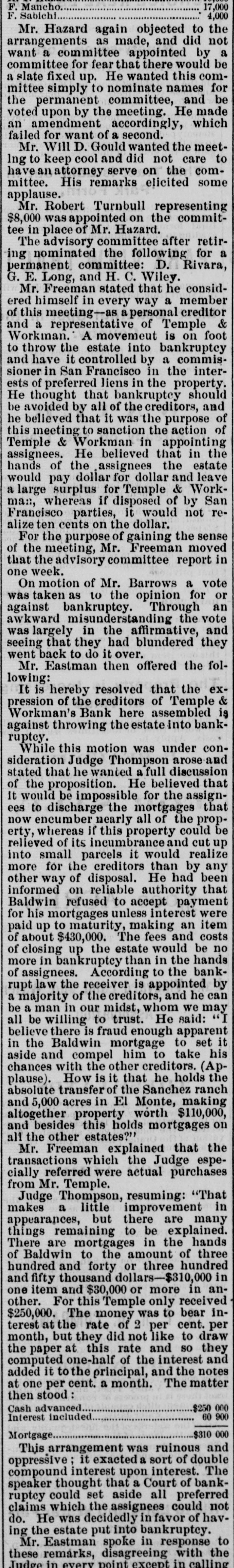 Mancho. 4,000 F. Sabichi to the arrangementmettee Mr. Hazard again as made, appointed objected and would did by not be a want a that there coma committee slate fixed for up. to fear He nominate wanted names this and for be mittee simply committee, made the voted permanent upon by the meeting. accordingly, He which an amendment of a second. failed for want D. Gould wanted the care meet- to Mr. Will keep cool and did on not the committee. havean Ing to attorney His remarks serve elicited some Mr. on applause. Turnbull the representing commitof Mr. after advisory following the D. Rivara, ing tee $8,000 The in place Robert wasappointed.org committee for retir- a C. Wiley. permanent nominated committee: and H. considE. Long, stated that he Mr. himself in every way ered G. Freeman personal a creditor member foot & of this a meeting-as representative of Temple is on and Workman. A estate movement into bankruptcy commisthrow controlled by the and sioner to have the it Francisco in a property. interin preferred San liens in the should of that bankruptcy creditors, and that the action Workman in believed ests Temple he this He be believed avoided thought meeting & by He to all sanction it of was the in the that the appointing purpose estate the of of assignees. the assignees and leave hands of dollar for dollar & Workwould large pay surplus for disposed Temple of by San reman, whereas parties, if it would not Francisco on the dollar. sense alizeten cents of gaining the of the advisory committee to as week. of Mr. for was taken one that On For the motion the meeting, purpose Mr. the Barrows Freeman opinion report a moved vote an or in Through vote against awkward misunderstanding . bankruptcy. the affirmative, the they and seeing to do it over. was largely that they in had blundered folwent back Eastman then offered the that is hereby of lowing: It Mr. creditors resolved Temple the ex- is & against Workman's pression throwing of the Bank the here estate assembled into bankruptey. this motion was under arose con- and sideration While Judge Thompson a full discussion that stated that he wanted He believed assignof the proposition. be impossible for the to discharge all of the if this cut ees now it would encumber nearly the property mortgages could prop- that up be erty, whereas incumbrance and realize relieved of its parcels it would into small creditors than more for of disposal. authority other way the on reliable He had payment by been that any informed Baldwin refused unless to accept interest were item his mortgages making an to fees and about $430,000. estate would be for of paid of up maturity, the The the bank- hands costs no closing bankruptcy up than in the more in According appointed to by the and he majority midst, whom a man in our He of a be rupt law assignees. of receiver the to creditors, trust. is said: we may can "I all be willing is fraud enough to apparent set it believe there Baldwin mortgage take his and compel creditors. How is it that aside chances in the with the other him Sanchez to he holds ranch (Ap- the plause). transfer in of El the Monte, making 5,000 acres worth this holds and and absolute altogether besides property estates?' mortgages that $110,000, espe- the on all Mr. the Freeman other explained the Judge transactions referred were actual from Mr. Thompson, cially Judge Temple. little which improvement resuming: purchases "That many in makes a there are appearances, but to be explained. hands things remaining in the of There Baldwin are mortgages to the or amount three of hundred three in hundred and thousand forty dollars-$ more $310,000 in anand fifty item and $30,000 or only received other. one For this Temple was to bear in$250,000. The rate money of 2 per cent. draw per month, terest at but the they did not and like so to they at this rate interest and the paper one-half of the and the notes then stood computed added at one it per to cent. the principal, a month. The matter $250 000 60 900 Cash Interest advanced... included $310 000 and ruinous Mortgage This arrangement exacted was a sort of double The oppressive interest it upon interest. of bankcompound speaker thought set that aside a Court all could preferred not ruptcy could the assignees of havclaims do. He which was decidedly put into in bankruptcy. favor to ing the estate spoke in response with the Mr. Eastman disagreeing Tudge these remarks, in every point except in calling