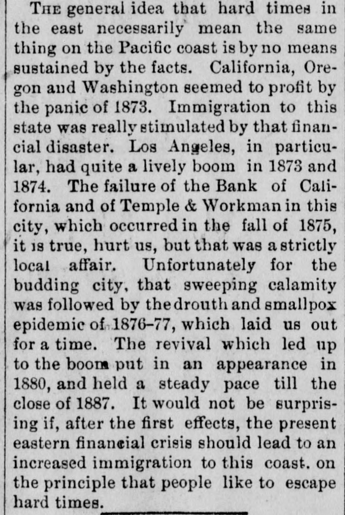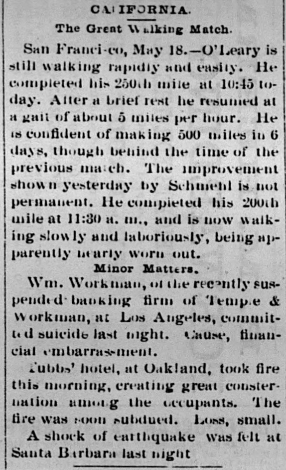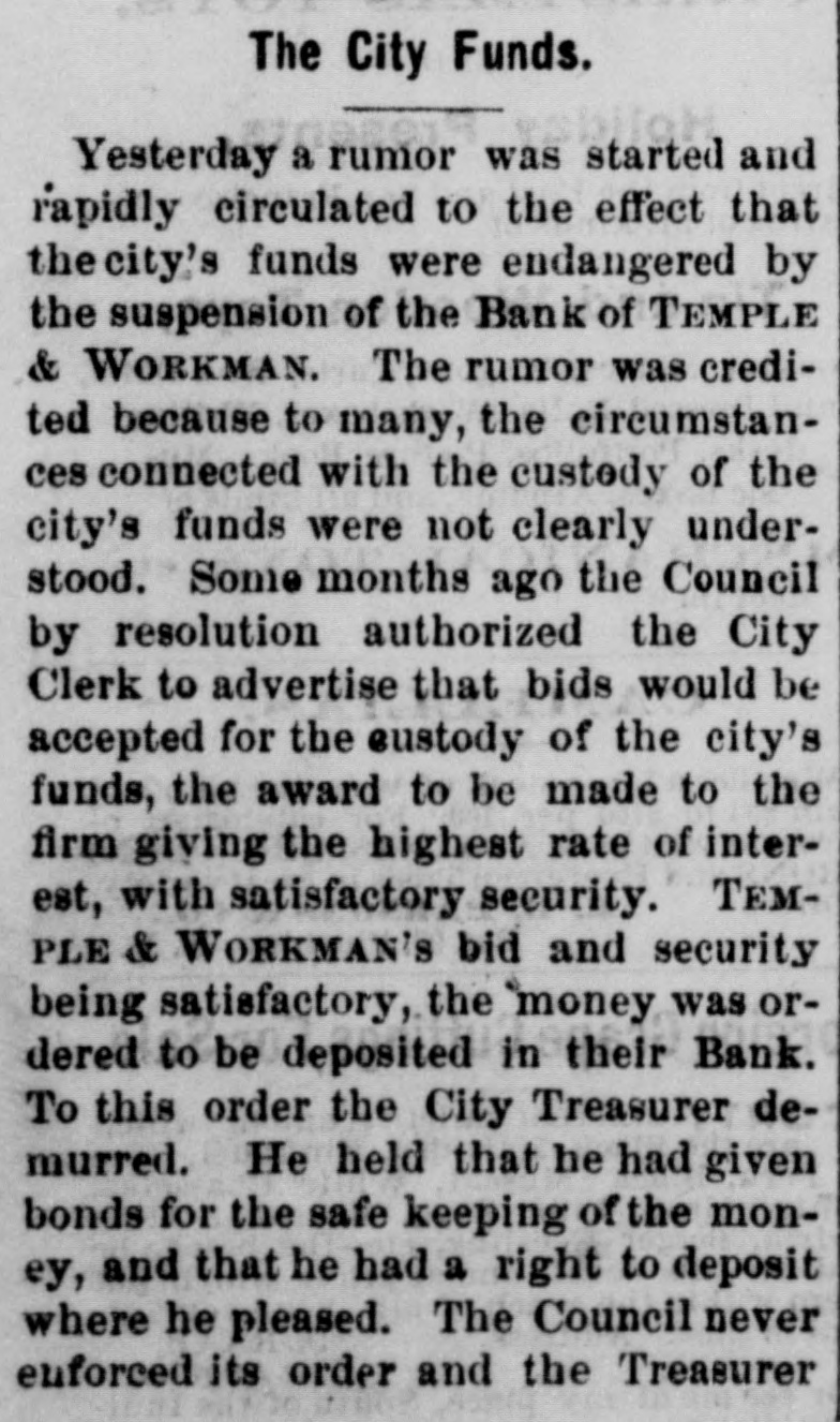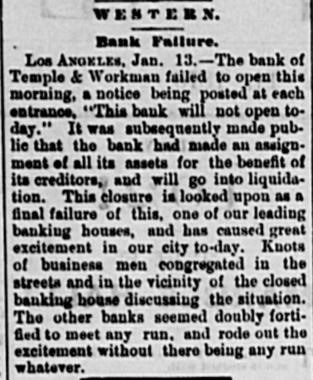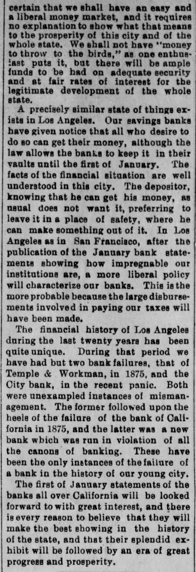 Mancho. 4,000 F. Sabichi to the arrangementmettee Mr. Hazard again as made, appointed objected and would did by not be a want a that there coma committee slate fixed for up. to fear He nominate wanted names this and for be mittee simply committee, made the voted permanent upon by the meeting. accordingly, He which an amendment of a second. failed for want D. Gould wanted the care meet- to Mr. Will keep cool and did on not the committee. havean Ing to attorney His remarks serve elicited some Mr. on applause. Turnbull the representing commitof Mr. after advisory following the D. Rivara, ing tee $8,000 The in place Robert wasappointed.org committee for retir- a C. Wiley. permanent nominated committee: and H. considE. Long, stated that he Mr. himself in every way ered G. Freeman personal a creditor member foot & of this a meeting-as representative of Temple is on and Workman. A estate movement into bankruptcy commisthrow controlled by the and sioner to have the it Francisco in a property. interin preferred San liens in the should of that bankruptcy creditors, and that the action Workman in believed ests Temple he this He be believed avoided thought meeting & by He to all sanction it of was the in the that the appointing purpose estate the of of assignees. the assignees and leave hands of dollar for dollar & Workwould large pay surplus for disposed Temple of by San reman, whereas parties, if it would not Francisco on the dollar. sense alizeten cents of gaining the of the advisory committee to as week. of Mr. for was taken one that On For the motion the meeting, purpose Mr. the Barrows Freeman opinion report a moved vote an or in Through vote against awkward misunderstanding . bankruptcy. the affirmative, the they and seeing to do it over. was largely that they in had blundered folwent back Eastman then offered the that is hereby of lowing: It Mr. creditors resolved Temple the ex- is & against Workman's pression throwing of the Bank the here estate assembled into bankruptey. this motion was under arose con- and sideration While Judge Thompson a full discussion that stated that he wanted He believed assignof the proposition. be impossible for the to discharge all of the if this cut ees now it would encumber nearly the property mortgages could prop- that up be erty, whereas incumbrance and realize relieved of its parcels it would into small creditors than more for of disposal. authority other way the on reliable He had payment by been that any informed Baldwin refused unless to accept interest were item his mortgages making an to fees and about $430,000. estate would be for of paid of up maturity, the The the bank- hands costs no closing bankruptcy up than in the more in According appointed to by the and he majority midst, whom a man in our He of a be rupt law assignees. of receiver the to creditors, trust. is said: we may can "I all be willing is fraud enough to apparent set it believe there Baldwin mortgage take his and compel creditors. How is it that aside chances in the with the other him Sanchez to he holds ranch (Ap- the plause). transfer in of El the Monte, making 5,000 acres worth this holds and and absolute altogether besides property estates?' mortgages that $110,000, espe- the on all Mr. the Freeman other explained the Judge transactions referred were actual from Mr. Thompson, cially Judge Temple. little which improvement resuming: purchases "That many in makes a there are appearances, but to be explained. hands things remaining in the of There Baldwin are mortgages to the or amount three of hundred three in hundred and thousand forty dollars-$ more $310,000 in anand fifty item and $30,000 or only received other. one For this Temple was to bear in$250,000. The rate money of 2 per cent. draw per month, terest at but the they did not and like so to they at this rate interest and the paper one-half of the and the notes then stood computed added at one it per to cent. the principal, a month. The matter $250 000 60 900 Cash Interest advanced... included $310 000 and ruinous Mortgage This arrangement exacted was a sort of double The oppressive interest it upon interest. of bankcompound speaker thought set that aside a Court all could preferred not ruptcy could the assignees of havclaims do. He which was decidedly put into in bankruptcy. favor to ing the estate spoke in response with the Mr. Eastman disagreeing Tudge these remarks, in every point except in calling