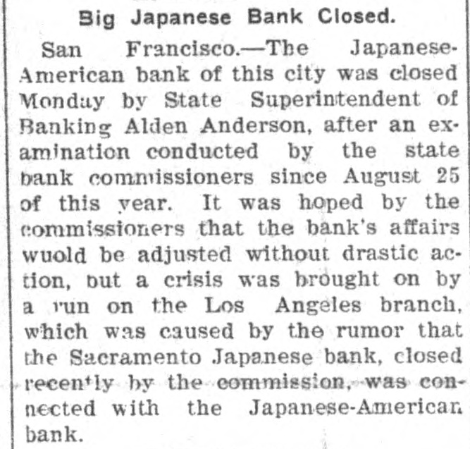 Big Japanese Bank Closed. San Francisco.-The JapaneseAmerican bank of this city was closed Monday by State Superintendent of Banking Alden Anderson, after an examination conducted by the state bank commissioners since August 25 of this year. It was hoped by the commissioners that the bank's affairs wuold be adjusted without drastic action, but a crisis was brought on by a run on the Los Angeles branch, which was caused by the rumor that the Sacramento Japanese bank, closed recently by the commission, was connected with the Japanese-American bank.