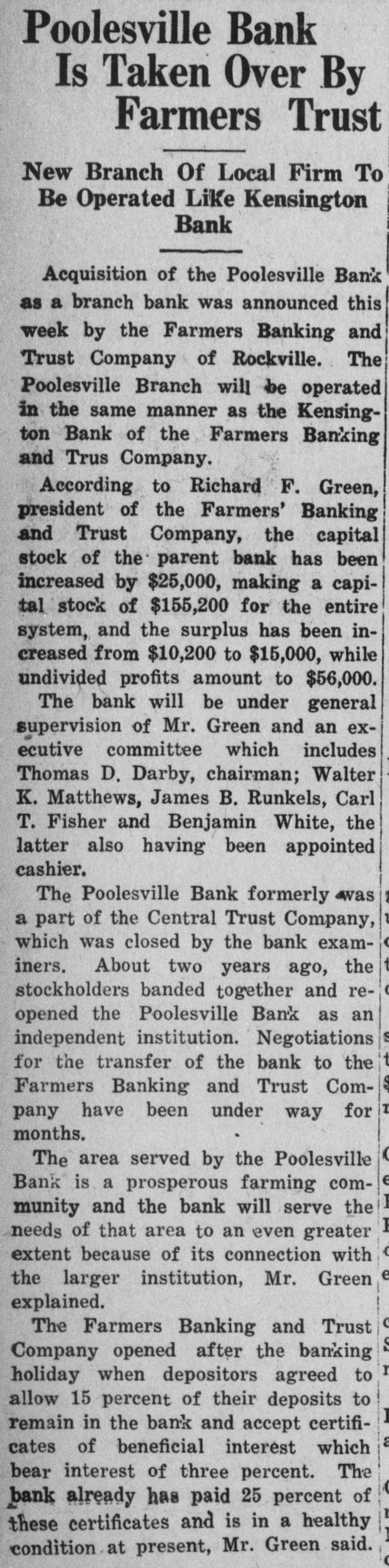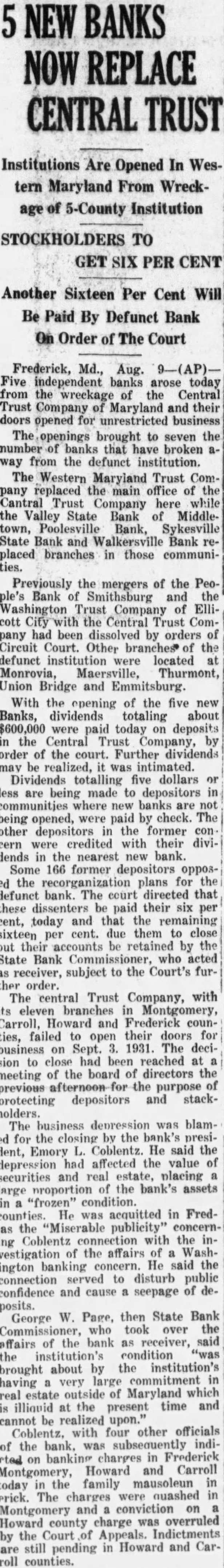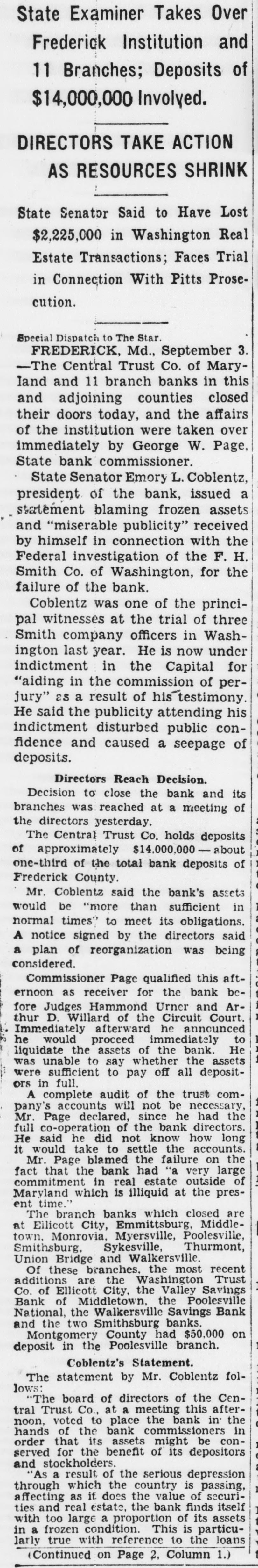 State Examiner Takes Over Frederick Institution and 11 Branches; Deposits of $14,000,000 Involved. DIRECTORS TAKE ACTION AS RESOURCES SHRINK State Senator Said to Have Lost $2,225,000 in Washington Real Estate Transactions; Faces Trial in Connection With Pitts Prosecution. Special Dispatch to The Star. FREDERICK, Md., September 3. -The Central Trust Co. of Maryland and 11 branch banks in this and adjoining counties closed their doors today, and the affairs of the institution were taken over immediately by George W. Page, State bank commissioner. State Senator Emory L. Coblentz, president of the bank, issued a statement blaming frozen assets and "miserable publicity" received by himself in connection with the Federal investigation of the F. H. Smith Co. of Washington, for the failure of the bank. Coblentz was one of the principal witnesses at the trial of three Smith company officers in Washington last year. He is now under indictment in the Capital for "aiding in the commission of perjury" as a result of his testimony. He said the publicity attending his indictment disturbed public confidence and caused a seepage of deposits. Directors Reach Decision. Decision to close the bank and its branches was reached at a meeting of the directors yesterday. The Central Trust Co. holds deposits of approximately $14,000,000 about one-third of the total bank deposits of Fredcrick County. Mr. Coblentz said the bank's assets would be "more than sufficient in normal times" to meet its obligations. A notice signed by the directors said a plan of reorganization was being considered. Commissioner Page qualified this afternoon as receiver for the bank before Judges Hammond Urner and Arthur D. Willard of the Circuit Court. Immediately afterward he announced he would proceed immediately to liquidate the assets of the bank. He was unable to say whether the assets were sufficient to pay off all depositors in full. A complete audit of the trust company's accounts will not be necessary, Mr. Page declared, since he had the full co-operation of the bank directors. He said he did not know how long it would take to settle the accounts. Mr. Page blamed the failure on the fact that the bank had "a very large commitment in real estate outside of Maryland which is illiquid at the present time." The branch banks which closed are at Ellicott City, Emmittsburg, Middletown. Monrovia, Myersville, Poolesville, Smithsburg, Sykesville, Thurmont, Union Bridge and Walkersville. Of these branches. the most recent additions are the Washington Trust Co. of Ellicott City, the Valley Savings Bank of Middletown, the Poolesville National, the Walkersville Savings Bank and the two Smithsburg banks. Montgomery County had $50,000 on deposit in the Poolesville branch. Coblentz's Statement. The statement by Mr. Coblentz follows: "The board of directors of the Central Trust Co., at a meeting this afternoon, voted to place the bank in the hands of the bank commissioners in order that its assets might be conserved for the benefit of its depositors and stockholders. "As a result of the serious depression through which the country is passing, affecting as it does the value of securities and real estate, the bank finds itself with too large a proportion of its assets in a frozen condition. This is particularly true with reference to the loans (Continued on Page 2. Column 1.)