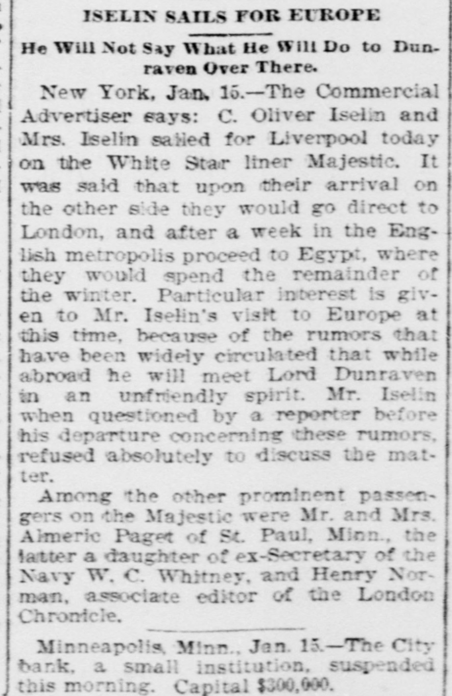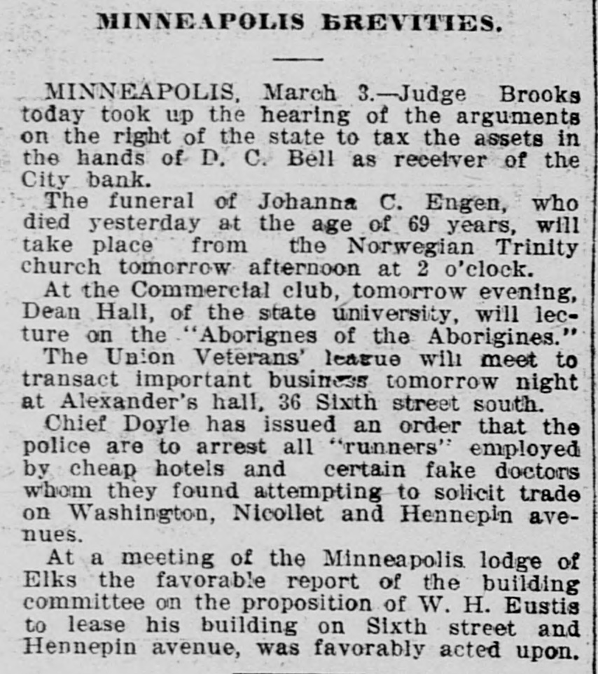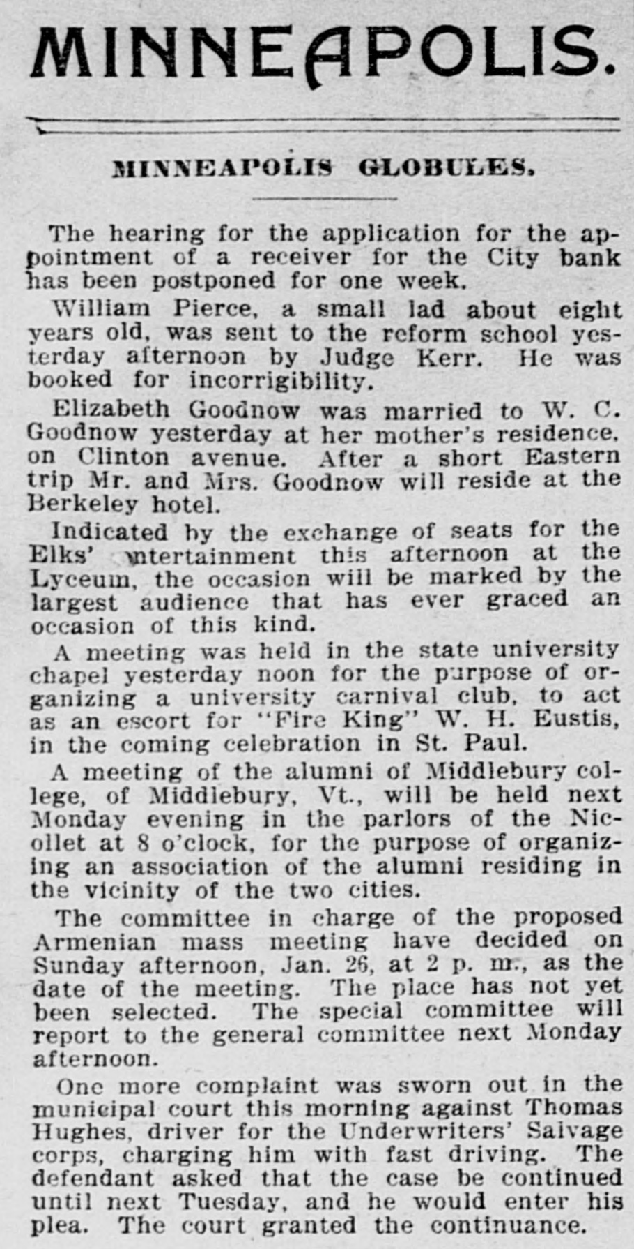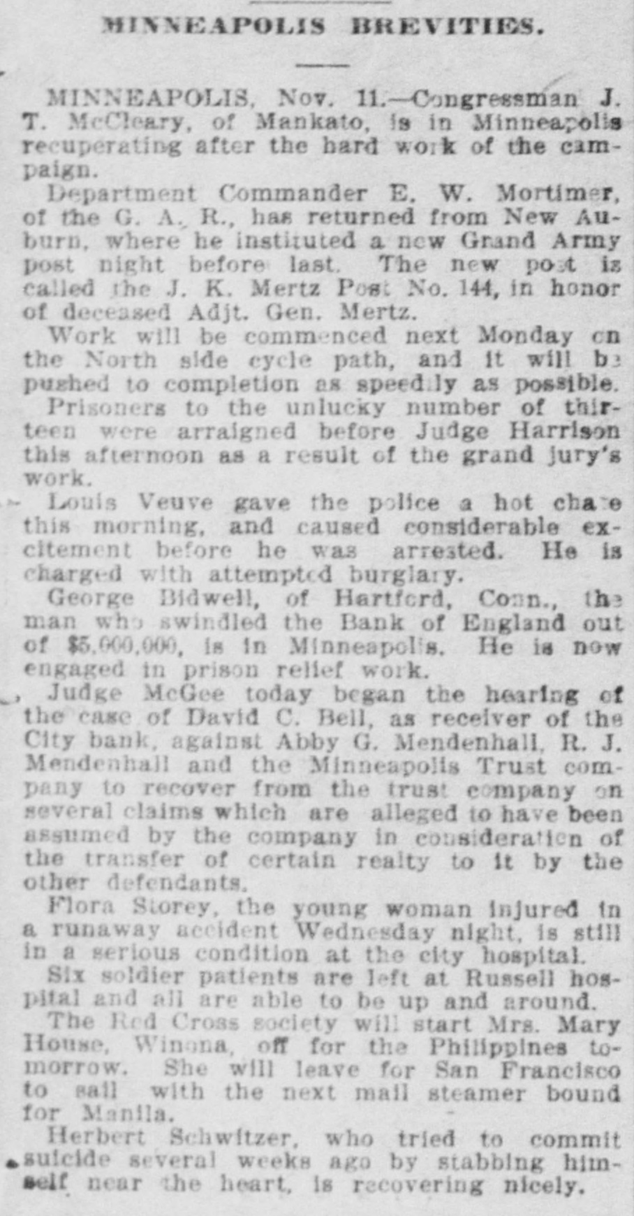 DOMESTIC. The business portion of Pleasant Green, Mo., was destroyed by fire. In a family quarrel at their home near Jonesboro, Tenn., Joseph P. Dove and one of his sons and a daughter were killed. The government bond syndicate organized in New York by J. P. Morgan & Co., was dissolved. The Bank of Wauneta, Neb., failed to open its doors. After a cataleptic sleep of seven years, William Depue, a prominent citizen of Bushkill, Pa., suddenly returned to consciousness and good health. C. T. Eberts, a dentist at Holt, Mo., kissed the wife of a business man while filling her teeth, and was chased out of town by indignant citizens. W. L. Moody, brother of Dwight L. Moody, the evangelist, died in Kansas City, Mo., the result of injuries received in a railroad accident. He was a stockman and lived at Gardner, Kan. Near Fort Holmes, O. T., four outlaws met death at the hands of a vigilance committee composed of ranchers. The City bank in Minneapolis, Minn., suspended payment with liabilities of $150,000. Seidenberg, Stieffel & Co., cigar manufacturers in New York, failed for $275,000. At the meeting in Washington of the democratic national committee it was decided to hold the national convention, in Chicago on July 7. The Irish-American bank closed its doors at Minneapolis, Minn. Gen. Ballington Booth has purchased a farm in Bergen county, N. J., to be used as a home for worn-out Salvation Army officers. Gen. F. M. Drake was inaugurated governor of Iowa at the state house in Des Moines. Fire destroyed a large portion of the business interests of Nashville, Ind. Perkins & Welsh, sugar importers and exporters in New York, failed for $500,000. Kahn, Schoenbrun & Co., manufacturers and wholesale dealers in fine clothing in Chicago, failed for $300,000. Over 600 women employed by the Westinghouse Electric company in Pittsburgh struck because of reduction in their wages. The American Protective Tariff league in annual session at New York elected Cornelius N. Bliss president and Wilbur F. Wakeman secretary. The National Dairy union in session, in Chicago elected W. H. Hatch, of Miscouri, as president. White caps ordered W. M. Hertel to discharge a colored employe in his factory near Lima, O. He did not do so and all his property was burned. The next G. A. R. encampment of Indiana will be held in South Bend, May 13 and 14. Thomas Yost, aged 65, was divorced at Burlington, Ia., and within 30 minutes had secured a license to marry Mrs. William Frost, widow of a Methodist minister. Misses Minnie and Flora, aged 18 years, twin daughters of James Davenport, living at Fayette, Ind., died near the same hour of typhoid fever. During their lives they had never been separated from each other over night. Five masked men entered the house of Joseph Day, an old farmer at Flynn's Lick, Tenn., who was reputed to have money hidden away, ard killed Mr. Day and his wife, but faued to find the money. James Hansen and his wife and five children were buried in one grave in Oakwoods cemetery in Chicago. All were suffocated by gas turned on by Mr. Hansen, who had become despondent over money losses. The two children of Mrs. George Spraggins were burned to death in their home near Petersburg, Ind. The Farmers' national bank at Portsmouth, O., suspended payment. Every business house at Oakland City, Ind., was destroyed by fire. Seven negro laborera who were sleeping in an underground camp near Williams, S. C., were killed by the earth above falling on them.