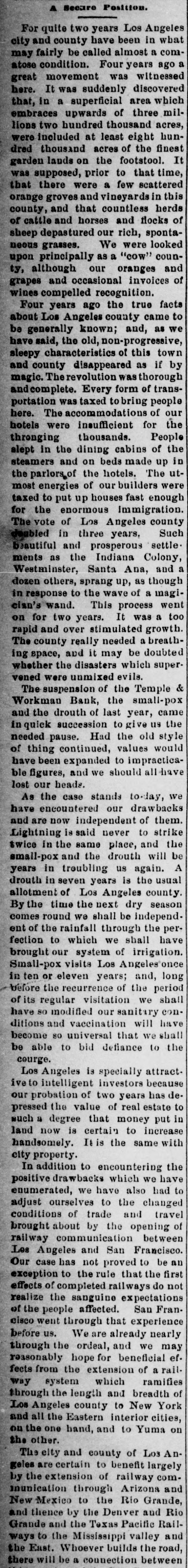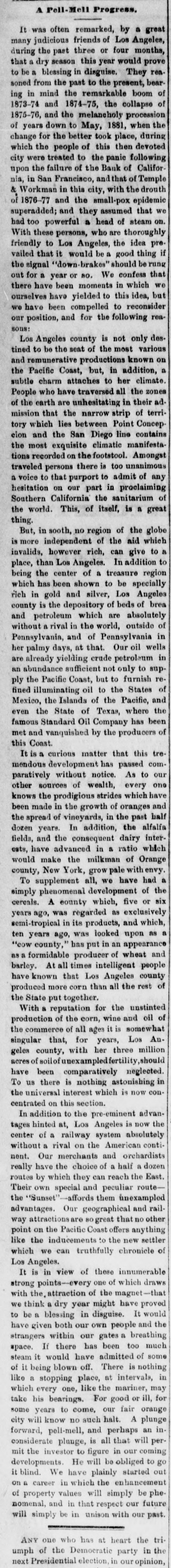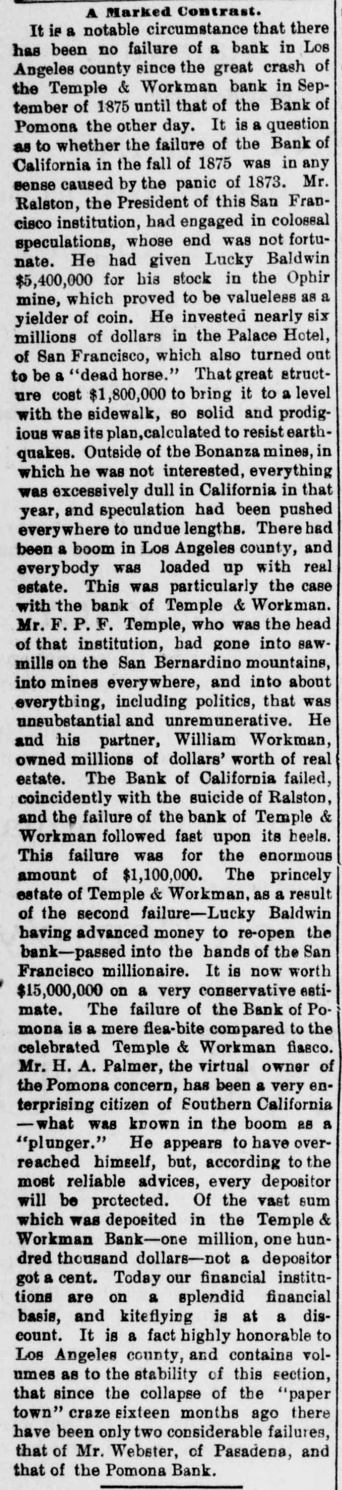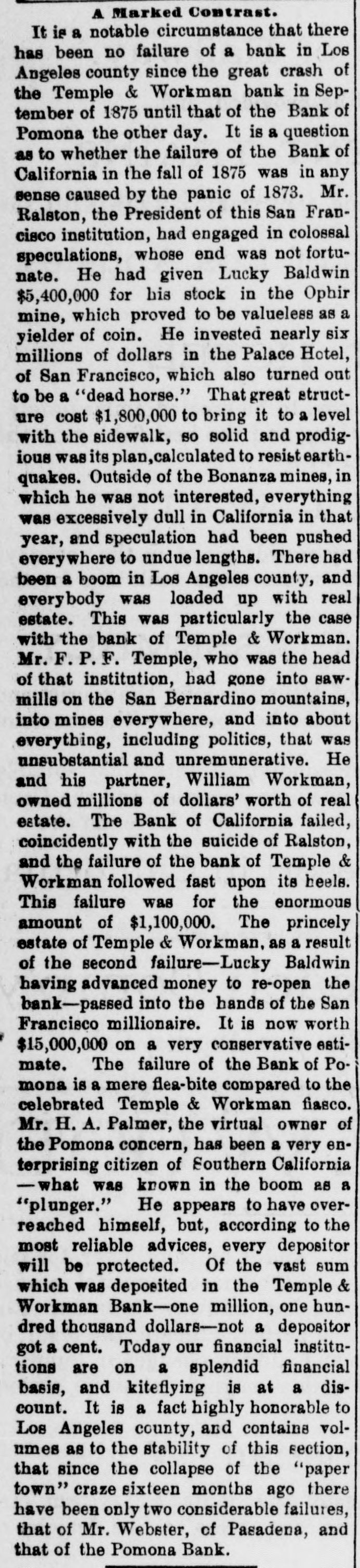 SPIRIT OF THE :PRESS. Joseph Gordello, says the Sentinel of the 23d, who has been confined in County Jail, supposed to be insane, was yes, terday brought before the Lunacy Commissioners and found to be suffering from dementia, and he will be sent to : the Woodbridge Asylum in a day or two. His friends have hopes that he will be soon restored to reason under the proper medical treatment. Although of frequent occurrence in the Artic regions, says the Sentinel of the 23d, a sun dog is rarely seen in this part of the country. Yesterday morning two made their appearance a few degrees from either side of the sun, and attracted considerable attention. They are supposed to be formed by the intersection of two or more halos, or in a manner similar to that of halos. It is said that the sun dog prognosticates cold weather, and after last night no one hereabouts will be inclined to doubt the truth of the the remark. The Virginia Chronicle of the 22d says: The ice-house of the Virginia & Gold Hill Water Company, on the Divide, is now full, and the reservoir is covered with thick ice again. Upon this people will be allowed to skate if they will refrain from spitting tobacco juice upon the ice. This is rendered necessary by the fastidiousness of some people who object to frozen tobacco juice in their Summer cocktails. Meantime we may be allowed to express our gratification that Virginia's water supply dosen't come from that reservoir. The tunnel of the Virginia City and Gold Hill Water Company near Marlette Lake, in the Sierra Nevada, will, when completed, be 5,000 feet long. At present work is being done on both ends of it, and a distance of 1,200 has been excavated. The progress is at the rate of 65 feet per week. The rock is now hard, but it is easy drifting compared with that which had to be done soon after starting at the western end of the tunnel. At this point a crevice in the rock five feet in width was struck, through which quick-sand rushed with the rapidity and violence of water, completely filling the tunnel, and it took sixty-eight days to get passed this awkward little gap in the granite. At the eastern end a similar crevice was encountered. two feet and a half in width, which it took fifty days to pass. It is to be hoped that there are no more crevices. No statement is yet ready says the , Los Angeles Expresa, as to the affairs of the Temple and Workman Bank. l The field of conjecture is large, but we prefer not to enter it. The rumors are, too, legion. The most reliable opinion is that, if the affairs of / the bank and real estate of the Messrs. ) Temple & Workman is fairly adminisI tered there will be enough to pay the ) creditors and depositors dollar for dollar and leave a anrplus over for the 9 Moesrs. Temple & Workman. A por3 tion of the creditors are in favor of 9 throwing the bank into bankruptcy, t while another and larger portion are in favor of appointing a committee to ad, minister upon the estate, paying Mr. 3 Baldwin and the other mortgage and ) deposit creditors a pro rata. Another large portion of the public have the most entire confidence in the assignment t and in the assignees, the Messrs. Free9 man & Spence. We, in this summary, merely reflect the rumors of the day, as they reach us. A statement of the affairs f of the Bank will doubtless be made public in a few days, and we suspend I all comment of our own until this is done.