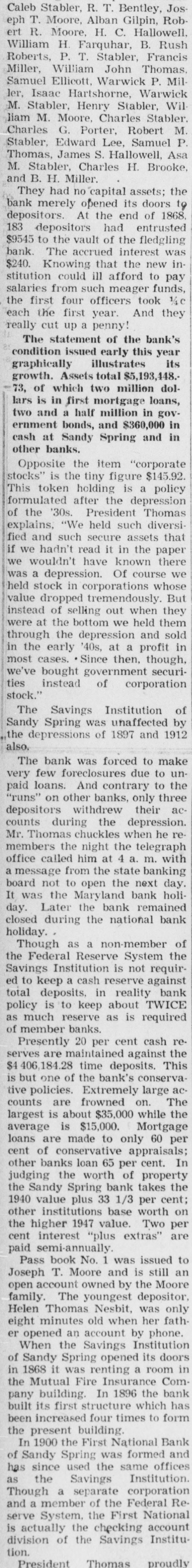 M. Stabler, Henry Stabler, Wil liam M. Moore, Charles Stabler Charles G. Porter, Robert M. Stabler, Edward Lee, Samuel P Thomas, James S. Hallowell, Asa M. Stabler, Charles H. Brooke, and B. H. Miller. They had no capital assets; the bank merely opened its doors to depositors. At the end of 1868, 183 depositors had entrusted $9545 to the vault of the fledgling bank. The accrued interest was $240. Knowing that the new institution could ill afford to pay salaries from such meager funds, the first four officers took 1/4c each the first year. And they really cut up a penny! The statement of the bank's condition issued early this year graphically illustrates its growth. Assets total $5,193,448.73, of which two million dollars is in first mortgage loans, two and a half million in government bonds, and $360,000 in cash at Sandy Spring and in other banks. Opposite the item "corporate stocks" is the tiny figure $145.92. This token holding is a policy formulated after the depression of the '30s. President Thomas explains, "We held such diversified and such secure assets that if we hadn't read it in the paper we wouldn't have known there was a depression. Of course we held stock in corporations whose value dropped tremendously. But instead of selling out when they were at the bottom we held them through the depression and sold in the early '40s, at a profit in most cases. Since then, though, we've bought government securities instead of corporation stock." The Savings Institution of Sandy Spring was unaffected by the depressions of 1897 and 1912 also. The bank was forced to make very few foreclosures due to unpaid loans. And contrary to the "runs" on other banks, only three depositors withdrew their accounts during the depression. Mr. Thomas chuckles when he remembers the night the telegraph office called him at 4 a. m. with a message from the state banking board not to open the next day. It was the Maryland bank holiday. Later the bank remained closed during the national bank holiday. Though as a non-member of the Federal Reserve System the Savings Institution is not required to keep a cash reserve against total deposits, in reality bank policy is to keep about TWICE as much reserve as is required of member banks. Presently 20 per cent cash reserves are maintained against the $4 406,184.28 time deposits. This is but one of the bank's conservative policies. Extremely large accounts are frowned on. The largest is about $35,000 while the average is $15,000. Mortgage loans are made to only 60 per cent of conservative appraisals; other banks loan 65 per cent. In judging the worth of property the Sandy Spring bank takes the 1940 value plus 33 1/3 per cent; other institutions base worth on the higher 1947 value. Two per cent interest "plus extras" are paid semi-annually. Pass book No. 1 was issued to Joseph T. Moore and is still an open account owned by the Moore family. The youngest depositor Helen Thomas Nesbit, was only eight minutes old when her fath er opened an account by phone. When the Savings Institution of Sandy Spring opened its doors in 1868 it was renting a room in the Mutual Fire Insurance Com pany building. In 1896 the bank built its first structure which has been increased four times to form the present building. In 1900 the First National Bank of Sandy Spring was formed and