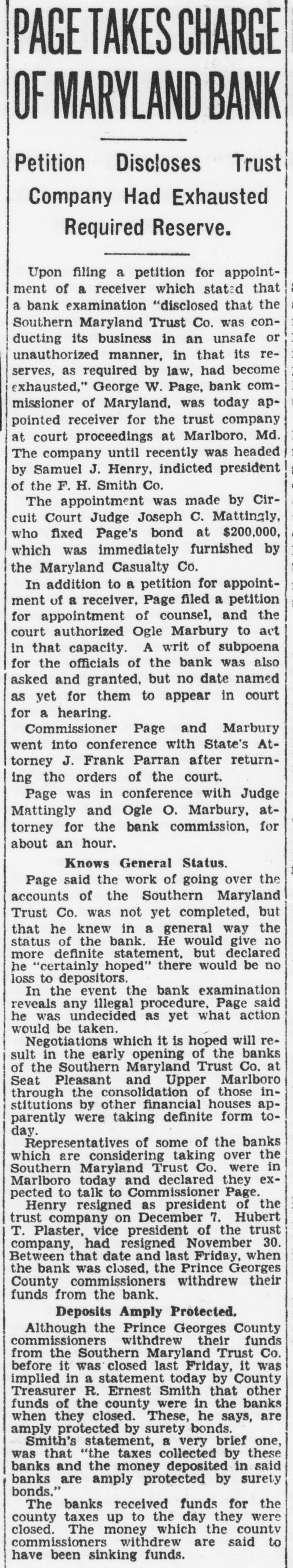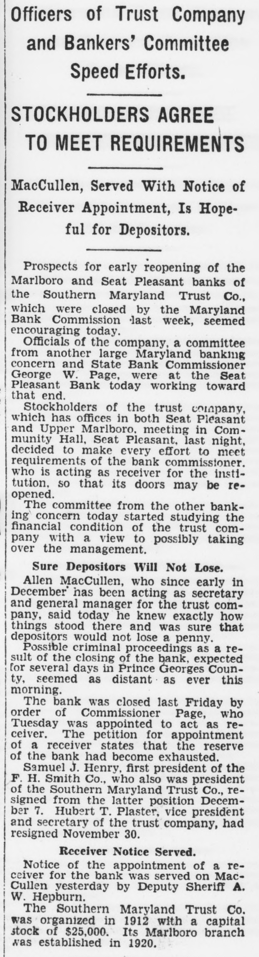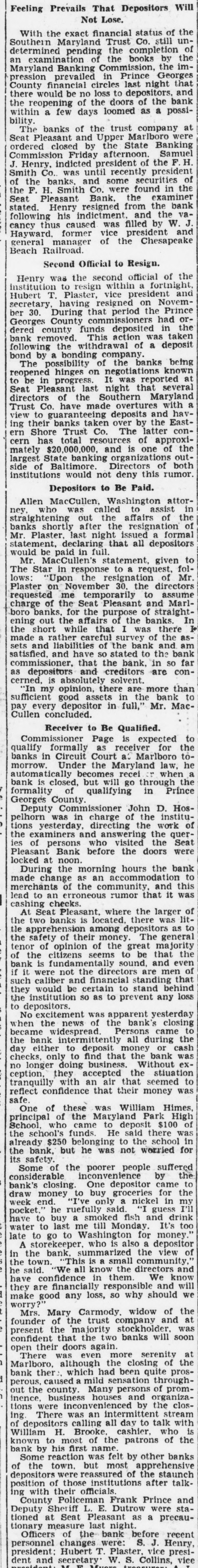 Feeling Prevails That Depositors Will Not Lose. With the exact financial status of the Southern Maryland Trust Co. still undetermined pending the completion o an examination of the books by the Maryland Banking Commission, the im pression prevailed in Prince Georges County financial circles last night that there would be no loss to depositors. and the reopening of the doors of the bank within a few days loomed as a possibility. The banks of the trust company at Seat Pleasant and Upper Marlboro were ordered closed by the State Banking Commission Friday afternoon. Samue J. Henry. indicted president of the F H Smith Co. was until recently president of the banks. and some securities of the F. H. Smith Co. were found in the Seat Pleasant Bank. the examiner stated. Henry resigned from the bank following his indictment. and the va cancy thus caused was filled by W. J Hayward. former vice president and general manager of the Chesapeake Beach Railroad. Second Official to Resign. Henry was the second official of the institution to resign within a fortnight Hubert T. Plaster, vice president and secretary, having resigned on Novem ber 30. During that period the Prince Georges County commissioners had or dered county funds deposited in the bank removed. This action was taker following the withdrawal of a deposit bond by a bonding company. The possibility of the banks being reopened hinges on negotiations known to be in progress. It was reported a Seat Pleasant last night that severa directors of the Southern Maryland Trust Co. have made overtures with a view to guaranteeing deposits and hav. ing their banks taken over by the East ern Shore Trust Co. The latter con cern has total resources of approximately $20,000,000. and is one of the largest State banking organizations out side of Baltimore. Directors of both institutions would not deny this rumor Depositors to Be Paid. Allen MacCullen, Washington attor ney. who was called to assist in straightening out the affairs of the banks shortly after the resignation o Mr. Plaster. last night issued a forma statement, declaring that all depositor would be paid in full. Mr. MacCullen's statement. given to The Star in response to a request, fol lows: Upon the resignation of Mr Plaster on November 30. the director requested me temporarily to assume charge of the Seat Pleasant and Marl boro banks, for the purpose of straight ening out the affairs of the banks. In the short while that I was there made rather careful survey of the as sets and liabilities of the bank and an satisfied. and have so stated to the banl commissioner. that the bank, in so fa as depositors and creditors are con cerned. is absolutely solvent. "In my opinion, there are more than sufficient good assets in the bank to pay every depositor in full," Mr. Mac Cullen concluded. Receiver to Be Qualified. Commissioner Page is expected to qualify formally as receiver for the banks in Circuit Court a: Marlboro to morrow. Under the Maryland law. h automatically becomes recei when bank is closed, but will go through the formality of qualifying in Princ Georges County. Deputy Commissioner John D. Hos pelhorn was in charge of the institu tions yesterday, directing the work o the examiners and answering the quer ies of persons who visited the Sea Pleasant Bank before the doors were locked at noon. During the morning hours the banl made change as an accommodation to merchants of the community, and this lead to an erroneous rumor that it wa cashing checks. At Seat Pleasant, where the larger o the two banks is located. there was lit tle apprehension among depositors as to the safety of their money. The genera tenor of opinion of the great majority of the citizens seems to be that the bank is fundamentally sound, and ever if it were not the directors are men o such caliber and financial standing that they would be certain to stand behind the institution so as to prevent any loss to depositors. No excitement was apparent yesterday when the news of the bank's closing became widespread Persons came to the bank intermittently all during the day either to deposit money or cash checks, only to find that the bank was no longer doing business. Without ex ception, they accepted the stiuation tranquilly with an air that seemed to reflect confidence that their money was safe. One of these was William Himes principal of the Maryland Park High School who came to deposit $100 of the school's funds. He said there was already $250 belonging to the school in the bank, but he was not worried for its safety. Some of the poorer people suffered considerable inconvenience by the bank's closing. One depositor came to draw money to buy groceries for the week end. "I've only a nickel in my pocket." he ruefully said. "I guess I'l have to buy a smoked fish and drink water to last me till Monday. It's too late to go to Washington for money A storekeeper, who is also a deposito in the bank. summarized the view o the town. This is small community, he said. "We all know the directors ano have confidence in them We know they are financially responsible and will make good any loss, SO why should w worry? Mrs. Mary Carmody. widow of th founder of the trust company and a present the majority stockholder. wa confident that the two banks will soor open their doors again There was even more serenity a Marlboro, although the closing of the bank there which had been quite prosperous, caused a mild sensation through out the county. Many persons of prom inence. business houses and organiza tions were inconvenienced by the closing There was an intermittent stream of depositors calling all day to talk with William H. Brooke, cashier, who known to most of the patrons of the bank by his first name Some reaction was felt by other bank of the town. but most apprehensive depositors were reassured of the staunch position of those institutions after talk ing with their officials. County Policeman Frank Prince and Deputy Sheriff L. E. Dutrow were sta tioned at 