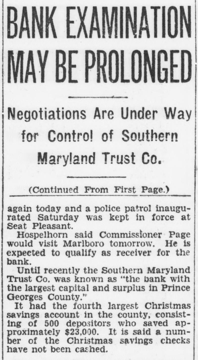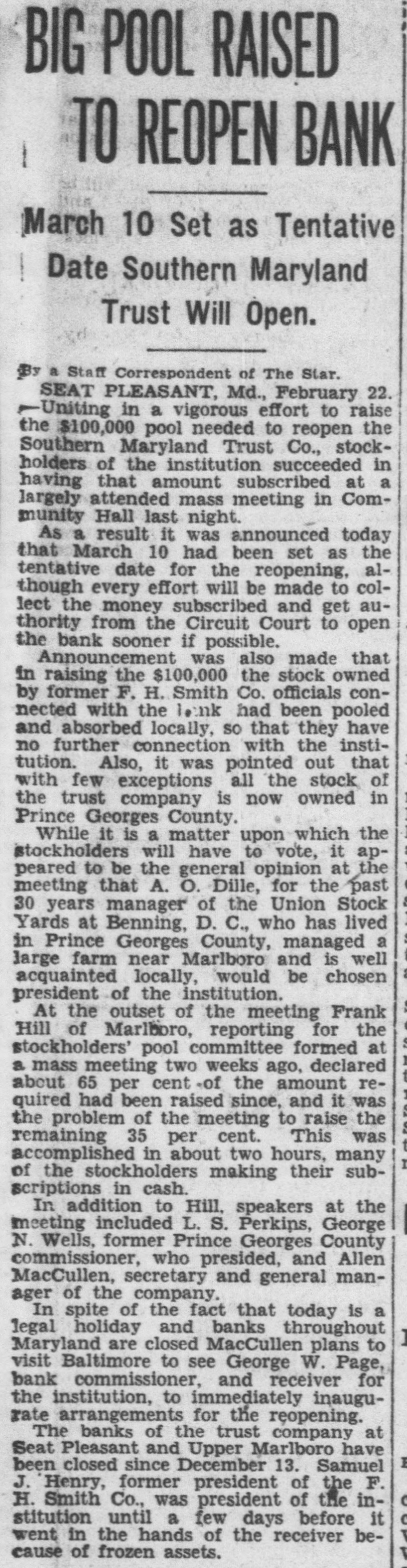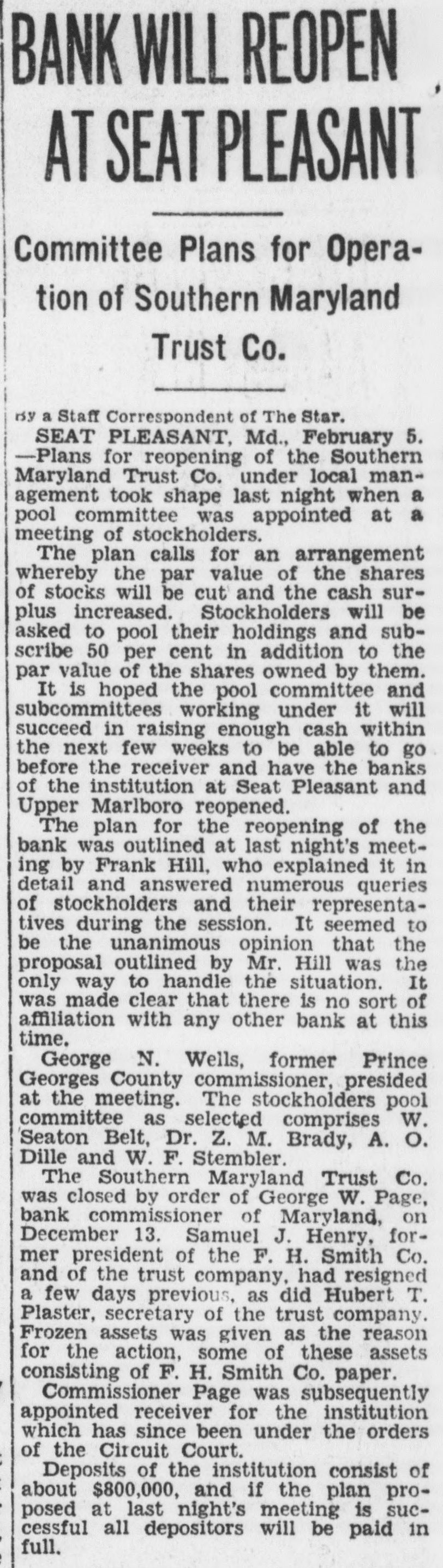 Feeling Prevails That Depositors Will Not Lose. With the exact financial status of the Southern Maryland Trust Co. still undetermined pending the completion o an examination of the books by the Maryland Banking Commission, the im pression prevailed in Prince Georges County financial circles last night that there would be no loss to depositors. and the reopening of the doors of the bank within a few days loomed as a possibility. The banks of the trust company at Seat Pleasant and Upper Marlboro were ordered closed by the State Banking Commission Friday afternoon. Samue J. Henry. indicted president of the F H Smith Co. was until recently president of the banks. and some securities of the F. H. Smith Co. were found in the Seat Pleasant Bank. the examiner stated. Henry resigned from the bank following his indictment. and the va cancy thus caused was filled by W. J Hayward. former vice president and general manager of the Chesapeake Beach Railroad. Second Official to Resign. Henry was the second official of the institution to resign within a fortnight Hubert T. Plaster, vice president and secretary, having resigned on Novem ber 30. During that period the Prince Georges County commissioners had or dered county funds deposited in the bank removed. This action was taker following the withdrawal of a deposit bond by a bonding company. The possibility of the banks being reopened hinges on negotiations known to be in progress. It was reported a Seat Pleasant last night that severa directors of the Southern Maryland Trust Co. have made overtures with a view to guaranteeing deposits and hav. ing their banks taken over by the East ern Shore Trust Co. The latter con cern has total resources of approximately $20,000,000. and is one of the largest State banking organizations out side of Baltimore. Directors of both institutions would not deny this rumor Depositors to Be Paid. Allen MacCullen, Washington attor ney. who was called to assist in straightening out the affairs of the banks shortly after the resignation o Mr. Plaster. last night issued a forma statement, declaring that all depositor would be paid in full. Mr. MacCullen's statement. given to The Star in response to a request, fol lows: Upon the resignation of Mr Plaster on November 30. the director requested me temporarily to assume charge of the Seat Pleasant and Marl boro banks, for the purpose of straight ening out the affairs of the banks. In the short while that I was there made rather careful survey of the as sets and liabilities of the bank and an satisfied. and have so stated to the banl commissioner. that the bank, in so fa as depositors and creditors are con cerned. is absolutely solvent. "In my opinion, there are more than sufficient good assets in the bank to pay every depositor in full," Mr. Mac Cullen concluded. Receiver to Be Qualified. Commissioner Page is expected to qualify formally as receiver for the banks in Circuit Court a: Marlboro to morrow. Under the Maryland law. h automatically becomes recei when bank is closed, but will go through the formality of qualifying in Princ Georges County. Deputy Commissioner John D. Hos pelhorn was in charge of the institu tions yesterday, directing the work o the examiners and answering the quer ies of persons who visited the Sea Pleasant Bank before the doors were locked at noon. During the morning hours the banl made change as an accommodation to merchants of the community, and this lead to an erroneous rumor that it wa cashing checks. At Seat Pleasant, where the larger o the two banks is located. there was lit tle apprehension among depositors as to the safety of their money. The genera tenor of opinion of the great majority of the citizens seems to be that the bank is fundamentally sound, and ever if it were not the directors are men o such caliber and financial standing that they would be certain to stand behind the institution so as to prevent any loss to depositors. No excitement was apparent yesterday when the news of the bank's closing became widespread Persons came to the bank intermittently all during the day either to deposit money or cash checks, only to find that the bank was no longer doing business. Without ex ception, they accepted the stiuation tranquilly with an air that seemed to reflect confidence that their money was safe. One of these was William Himes principal of the Maryland Park High School who came to deposit $100 of the school's funds. He said there was already $250 belonging to the school in the bank, but he was not worried for its safety. Some of the poorer people suffered considerable inconvenience by the bank's closing. One depositor came to draw money to buy groceries for the week end. "I've only a nickel in my pocket." he ruefully said. "I guess I'l have to buy a smoked fish and drink water to last me till Monday. It's too late to go to Washington for money A storekeeper, who is also a deposito in the bank. summarized the view o the town. This is small community, he said. "We all know the directors ano have confidence in them We know they are financially responsible and will make good any loss, SO why should w worry? Mrs. Mary Carmody. widow of th founder of the trust company and a present the majority stockholder. wa confident that the two banks will soor open their doors again There was even more serenity a Marlboro, although the closing of the bank there which had been quite prosperous, caused a mild sensation through out the county. Many persons of prom inence. business houses and organiza tions were inconvenienced by the closing There was an intermittent stream of depositors calling all day to talk with William H. Brooke, cashier, who known to most of the patrons of the bank by his first name Some reaction was felt by other bank of the town. but most apprehensive depositors were reassured of the staunch position of those institutions after talk ing with their officials. County Policeman Frank Prince and Deputy Sheriff L. E. Dutrow were sta tioned at 