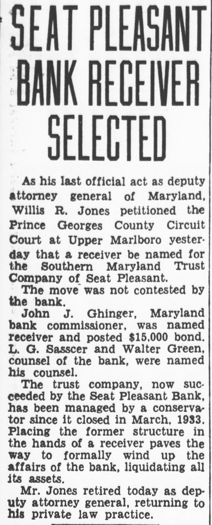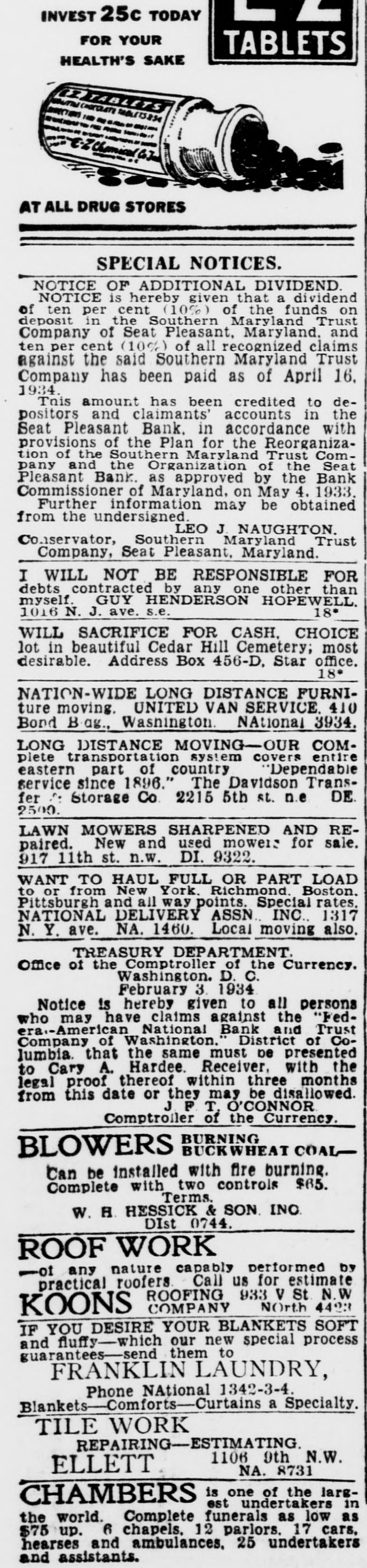 FOR YOUR TABLETS HEALTH'S SAKE AT ALL DRUG STORES SPECIAL NOTICES. NOTICE OF ADDITIONAL DIVIDEND. NOTICE is hereby given that a dividend of ten per cent (10%) of the funds on deposit in the Southern Maryland Trust Company of Seat Pleasant, Maryland, and ten per cent (10%) of all recognized claims against the said Southern Maryland Trust Company has been paid as of April 16, 1934. This amount has been credited to depositors and claimants' accounts in the Seat Pleasant Bank, in accordance with provisions of the Plan for the Reorganization of the Southern Maryland Trust Company and the Organization of the Seat Pleasant Bank. as approved by the Bank Commissioner of Maryland, on May 4. 1933. Further information may be obtained from the undersigned. LEO J NAUGHTON. Conservator, Southern Maryland Trust Company, Seat Pleasant. Maryland. I WILL NOT BE RESPONSIBLE FOR debts contracted by any one other than myself. GUY HENDERSON HOPEWELL. 18* 1016 N. J. ave. s.e. WILL SACRIFICE FOR CASH, CHOICE lot in beautiful Cedar Hill Cemetery; most desirable. Address Box 456-D, Star office. 18* NATION-WIDE LONG DISTANCE FURNIture moving. UNITED VAN SERVICE. 410 Bond B ag., Washington. NAtional 3934. LONG DISTANCE MOVING-OUR COMplete transportation system covers entire eastern part of country Dependable service since 1896." The Davidson Transfer : Storage Co. 2215 5th st. n.e DE 2500. LAWN MOWERS SHARPENED AND REpaired. New and used moweis for sale. 917 11th st. n.w. DI. 9322. WANT TO HAUL FULL OR PART LOAD to or from New York. Richmond. Boston. Pittsburgh and all way points. Special rates. NATIONAL DELIVERY ASSN INC. 1317 N. Y. ave. NA. 1460. Local moving also. TREASURY DEPARTMENT Office of the Comptroller of the Currency. Washington. D. C. February 3. 1934 Notice is hereby given to all persons who may have claims against the "FedAmerican National Bank and Trust Company of Washington. District of Columbia. that the same must be presented to Cary A. Hardee. Receiver, with the legal proof thereof within three months from this date or they may be disallowed. J F T, O'CONNOR Comptroller of the Currency. BLOWERS BUCKWHEAT BURNING COALCan be installed with fire burning. Complete with two controls $65. Terms. W. H HESSICK & SON INC Dist 0744. ROOF WORK -of any nature capably performed by practical roofers Call us for estimate ROOFING 933 V St N.W 4423 KOONS COMPANY North IF YOU DESIRE YOUR BLANKETS SOFT and fluffy-which our new special process guarantees-send them to FRANKLIN LAUNDRY, Phone NAtional 1342-3-4. BlanketsComforts-Curtains a Specialty. TILE WORK REPAIRING-ESTIMATING 1106 9th N.W. ELLETT NA. 8731 is one of the largCHAMBERS est undertakers in the world. Complete funerals as low as $75 up. 6 chapels, 12 parlors. 17 cars. hearses and ambulances. 25 undertakers and assistants.