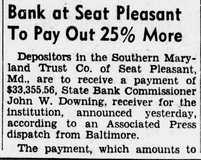 Bank at Seat Pleasant To Pay Out 25% More Depositors in the Southern Maryland Trust Co. of Seat Pleasant, Md., are to receive a payment of $33,355.56, State Bank Commissioner John W. Downing, receiver for the institution, announced yesterday, according to an Associated Press dispatch from Baltimore. The payment, which amounts to