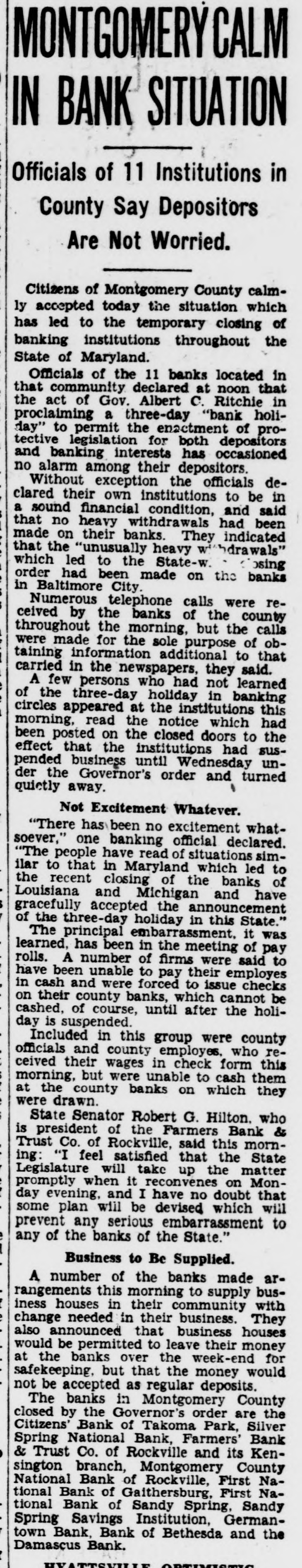 MONTGOMERYCALM IN BANK SITUATION Officials of 11 Institutions in County Say Depositors Are Not Worried. Citizens of Montgomery County calmly accepted today the situation which has led to the temporary closing of banking institutions throughout the State of Maryland. Officials of the 11 banks located in that community declared at noon that the act of Gov. Albert c. Ritchie in proclaiming a three-day "bank holiday" to permit the enactment of protective legislation for both depositors and banking interests has occasioned no alarm among their depositors. Without exception the officials declared their own institutions to be in a sound financial condition, and said that no heavy withdrawals had been made on their banks. They indicated that the "unusually heavy w drawals" osing which led to the State-w. order had been made on the banks in Baltimore City. Numerous telephone calls were received the banks of the throughout by morning, but the the county of calls obwere made for the sole purpose taining information additional to that carried in the newspapers, they said. A few persons who had not learned of the three-day holiday in banking circles appeared at the institutions this morning, read the notice which had been on the closed doors to the the susuntil unpended effect posted that business institutions Wednesday had der the Governor's order and turned quietly away. Not Excitement Whatever. "There has been no excitement whatsoever," one banking official declared. "The people have read of situations similar to that in Maryland which led to the recent closing of the banks of Louisiana and Michigan and have gracefully accepted the announcement of the three-day holiday in this State." The principal embarrassment. it was learned, has been in the meeting of pay rolls. A number of firms were said to have been unable to pay their employes in cash and were forced to issue checks on their county banks, which cannot be cashed, of course, until after the holiday is suspended. Included in this group were county officials and county employes. who received their wages in check form this morning, but were unable to cash them at the county banks on which they were drawn. State Senator Robert G. Hilton. who is president of the Farmers Bank & Trust Co. of Rockville, said this morning: "I feel satisfied that the State Legislature will take up the matter when it reconvenes on and I have no promptly day evening, which doubt Mon- that will plan will be devised serious to prevent some any embarrassment State." any of the banks of the Business to Be Supplied. of the banks made arthis morning to rangements A number supply with business houses in their community change needed in their business. They also announced that business houses would be permitted to leave their money at the banks over the week-end for safekeeping. but that the money would not be accepted as regular deposits. The banks in Montgomery County closed by the Governor's order are the Citizens Bank of Takoma Park, Silver Spring National Bank, Farmers' Bank & Trust Co. of Rockville and its Kensington branch, Montgomery County National Bank of Rockville, First National Bank of Gaithersburg, First National Bank of Sandy Spring, Sandy Spring Savings Institution, Germantown Bank, Bank of Bethesda and the Damascus Bank. UVATTSVILE