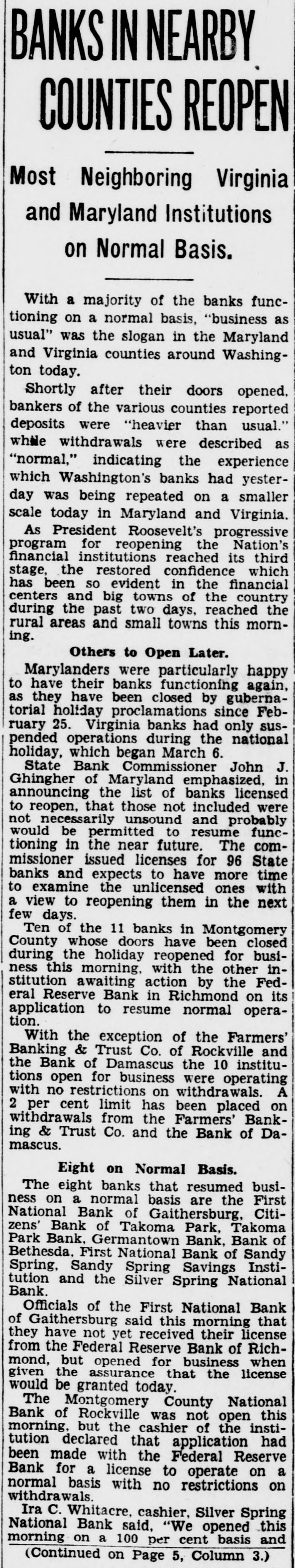 BANKS IN NEARBY COUNTIES REOPEN Most Neighboring Virginia and Maryland Institutions on Normal Basis. With a majority of the banks functioning on a normal basis, "business as usual" was the slogan in the Maryland and Virginia counties around Washington today. Shortly after their doors opened, bankers of the various counties reported deposits were "heavier than usual. while withdrawals were described as "normal," indicating the experience which Washington's banks had yesterday was being repeated on a smaller scale today in Maryland and Virginia. As President Roosevelt's progressive program for reopening the Nation's financial institutions reached its third stage, the restored confidence which has been so evident in the financial centers and big towns of the country during the past two days, reached the rural areas and small towns this morning. Others to Open Later. Marylanders were particularly happy to have their banks functioning again, as they have been closed by gubernatorial holiday proclamations since February 25. Virginia banks had only suspended operations during the national holiday, which began March 6. State Bank Commissioner John J. Ghingher of Maryland emphasized, in announcing the list of banks licensed to reopen, that those not included were not necessarily unsound and probably would be permitted to resume functioning in the near future. The commissioner issued licenses for 96 State banks and expects to have more time to examine the unlicensed ones with a view to reopening them in the next few days. Ten of the 11 banks in Montgomery County whose doors have been closed during the holiday reopened for business this morning, with the other institution awaiting action by the Federal Reserve Bank in Richmond on its application to resume normal operation. With the exception of the Farmers' Banking & Trust Co. of Rockville and the Bank of Damascus the 10 institutions open for business were operating with no restrictions on withdrawals. A 2 per cent limit has been placed on withdrawals from the Farmers' Banking & Trust Co. and the Bank of Damascus. Eight on Normal Basis. The eight banks that resumed business on a normal basis are the First National Bank of Gaithersburg, Citizens' Bank of Takoma Park, Takoma Park Bank. Germantown Bank, Bank of Bethesda. First National Bank of Sandy Spring, Sandy Spring Savings Institution and the Silver Spring National Bank. Officials of the First National Bank of Gaithersburg said this morning that they have not yet received their license from the Federal Reserve Bank of Richmond, but opened for business when given the assurance that the license would be granted today. The Montgomery County National Bank of Rockville was not open this morning, but the cashier of the institution declared that application had been made with the Federal Reserve Bank for a license to operate on a normal basis with no restrictions on withdrawals. Ira C. Whitacre, cashier, Silver Spring National Bank said, "We opened this morning on a 100 per cent basis and (Continued on Page 5, Column 3.)
