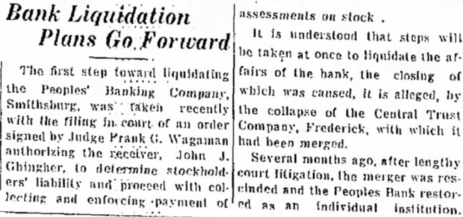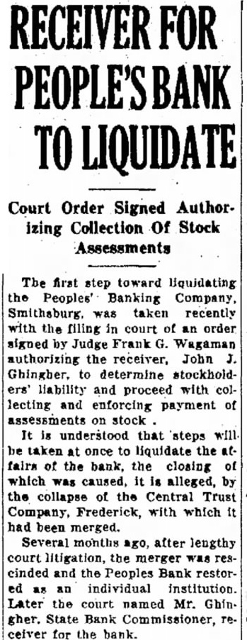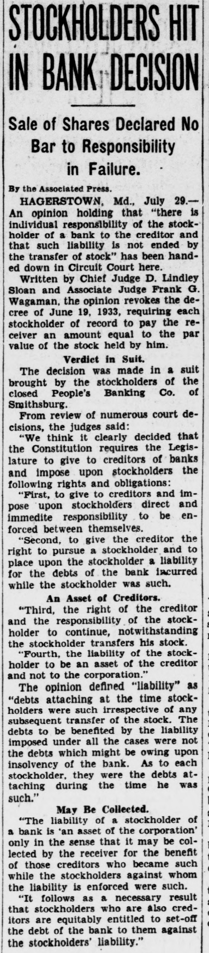 STOCKHOLDERS HIT IN BANK DECISION Sale of Shares Declared No Bar to Responsibility in Failure. By the Associated Press. HAGERSTOWN, Md., July 29.An opinion holding that "there is individual responsibility of the stockholder of a bank to the creditor and that such liability is not ended by the transfer of stock" has been handed down in Circuit Court here. Written by Chief Judge D. Lindley Sloan and Associate Judge Frank G. Wagaman, the opinion revokes the decree of June 19, 1933, requiring each stockholder of record to pay the receiver an amount equal to the par value of the stock held by him. Verdict in Suit. The decision was made in a suit brought by the stockholders of the closed People's Banking Co. of Smithsburg. From review of numerous court decisions, the judges said: "We think it clearly decided that the Constitution requires the Legislature to give to creditors of banks and impose upon stockholders the following rights and obligations: "First, to give to creditors and impose upon stockholders direct and immedite responsibility to be enforced between themselves. "Second, to give the creditor the right to pursue a stockholder and to place upon the stockholder a liability for the debts of the bank incurred while the stockholder was such. An Asset of Creditors. "Third, the right of the creditor and the responsibility of the stockholder to continue, notwithstanding the stockholder transfers his stock. "Fourth, the liability of the stockholder to be an asset of the creditor and not to the corporation." The opinion defined "liability" as "debts attaching at the time stockholders were such irrespective of any subsequent transfer of the stock. The debts to be benefited by the liability imposed under all the cases were not the debts which might be owing upon insolvency of the bank. As to each stockholder, they were the debts attaching during the time he was such." May Be Collected. "The liability of a stockholder of a bank is 'an asset of the corporation' only in the sense that it may be collected by the receiver for the benefit of those creditors who became such while the stockholders against whom the liability is enforced were such. "It follows as a necessary result that stockholders who are also creditors are equitably entitled to set-off the debt of the bank to them against the stockholders' liability."