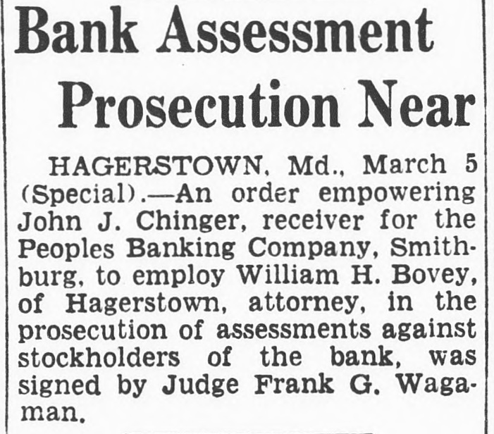 Bank Assessment Prosecution Near HAGERSTOWN. Md., March 5 (Special). .-An order empowering John J. Chinger, receiver for the Peoples Banking Company, Smithburg, to employ William H. Bovey, of Hagerstown, attorney, in the prosecution of assessments against stockholders of the bank, was signed by Judge Frank G. Wagaman.