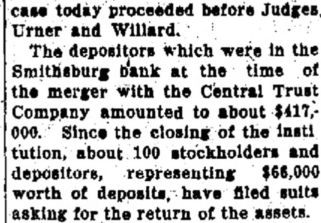 case today proceeded before Judges Urner and Willard. The depositors which were in the Smithsburg bank at the time of the merger with the Central Trust Company amounted to about $417,000. Since the closing of the insti tution, about 100 stockholders and depositors, representing $66,000 worth of deposits, have filed suits asking for the return of the assets.