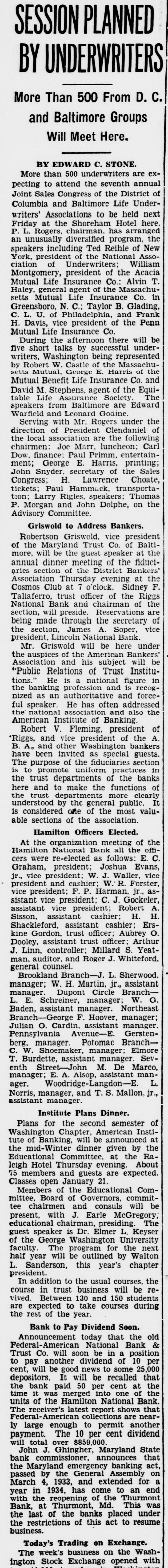 SESSION PLANNED BY UNDERWRITERS More Than 500 From D.C and Baltimore Groups Will Meet Here. BY EDWARD C. STONE. More than 500 underwriters are expecting to attend the seventh annual Joint Sales Congress of the District of Columbia and Baltimore Life Underwriters' Associations to be held next Friday at the Shoreham Hotel here arranged has chairman. L. Rogers P. an unusually diversified program, the speakers including Ted Reihle of New York, president of the National Association of Underwriters: William Montgomery, president of the Acacia Mutual Life Insurance Co Alvin T. Haley general agent of the Massachusetts Mutual Life Insurance Co. in Greensboro, N.C.: Taylor B. Glading, c L. U. of Philadelphia and Frank H Davis vice president of the Penn Mutual Life Insurance Co. During the afternoon there will be five short talks by successful underwriters, Washington being represented by Robert W Castle of the Massachusetts Mutual George Harris of the Mutual Benefit Life Insurance Co. and David M. Stephens, agent of the Equitable Life Society The speakers from Baltimore are Edward Warfield and Leonard Godine Serving with Mr Rogers under the direction of President Clendaniel of the local iation are the followin chairmen: Joe Marr. luncheon; Carl Dow. finance Paul Primm, entertainment George E Harris printing John Snyder. secretary of the Sales Congress H Lawrence Choate tickets: Paul Hammack, transportation Larry Rigles speakers Thomas P Morgan and John Dolphe, on the Advisory Committee Griswold to Address Bankers. Robertson Griswold. vice president of the Maryland Trust Co. of Balti more will be the guest speaker at the annual dinner meeting of the fiduciaries section of the District Bankers Association Thursday evening at the Cosmos Club at o'clock. Sidney F Taliaferro. trust officer of the Riggs National Bank and chairman of the section. will preside. Reservations are being made through the secretary of the section. James Soper, vice president, Lincoln National Bank Mr. Griswold will be here under the auspices of the American Bankers Association and his subject will be "Public Relations of Trust Institutions He national figure in the banking and recognized as an authoritative and forceful speaker He has often addressed the the nationa also and American Institute of Banking. of Robert V. Fleming, president 'Riggs, and vice president of the A. B. A., and other Washington bankers have been invited as special guests The purpose of the fiduciaries section to is practices uniform in promote the trust departments of the banks here and to make the functions of departments the clearly trust more understood by the general public It is considered one of the most valuable sections of the association. Hamilton Officers Elected. At the organization meeting of the Hamilton National Bank all the offi C cers were re-elected as follows E. Graham. president Joshua Evans, jr., vice president: W J. Waller. vice president and cashier W. R. Forster, vice president F P. Harman jr. assistant vice president; C. J. Gockeler, assistant vice president Robert H Sisson. assistant cashier: H Shackleford. assistant cashier Ers kine Gordon, trust officer; Aubrey o Dooley, assistant trust officer Arthur J. Linn, controller: Millard S Yeat man, auditor. and Roger J. Whiteford, general counsel Brookland Branch-J. L Sherwood. manager: W H. Martin. jr. assistant manager Dupont Circle BranchG L. E. Schreiner. manager W Baden, assistant manager. Northeast Branch George F Hoover manager; Julian o Cardin assistant manager Pennsvlvania Avenue-E. Gerstenberg, manager Potomac BranchC.W. Shoemaker, manager: Elmore T Burdette. assistant manager Seventh Street- John M. De Marco, manager; A. Alsop, assistant man L. ager Woodridge-Langdon-E. Norris. manager, and T. S. Mallon, jr. assistant manager Institute Plans Dinner. Plans for the second semester of Washington Chapter American Institute of Banking will be announced at the mid-Winter dinner given by the Educational Committee, at the Ra leigh Hotel Thursday evening. About 75 members and guests are expected. Classes open January 21 Members of the Educational Committee Board of Governors, commit tee chairmen and consuls will be present with J. Earle McGregory, educational chairman presiding The guest speaker is Dr Elmer L. Keyser of the George Washington University faculty The program for the next half year will be outlined by Walton L. Sanderson, this year's chapter president In addition to the usual courses, the course in trust business will be revived Between 130 and 150 students are expected to take courses during the rest of the year. Bank to Pay Dividend Soon Announcement today that the old Federal American National Bank & Trust Co. will soon be in a position to pay another dividend of 10 per cent. will be good news to some 25,000 depositors. It will be recalled that the bank paid 50 per cent at the time was merged into one of the units of the Hamilton National Bank. The receiver's latest report shows that deral-American collections are nearly large enough to permit another payment. The 10 per cent dividend will total over $859.000 John J. Ghingher. Marvland State bank commissioner. announces that the Marvland emergency banking act passed by the General Assembly on March 4. 1933, and extended for a year in 1934, has come to an end with the reopening of the Thurmont Bank, at Thurmont, Md. This was the last of the banks placed under the restrictions of this act to resume business. Today's Trading on Exchange. The week's business on the Washington Stock Exchange opened with