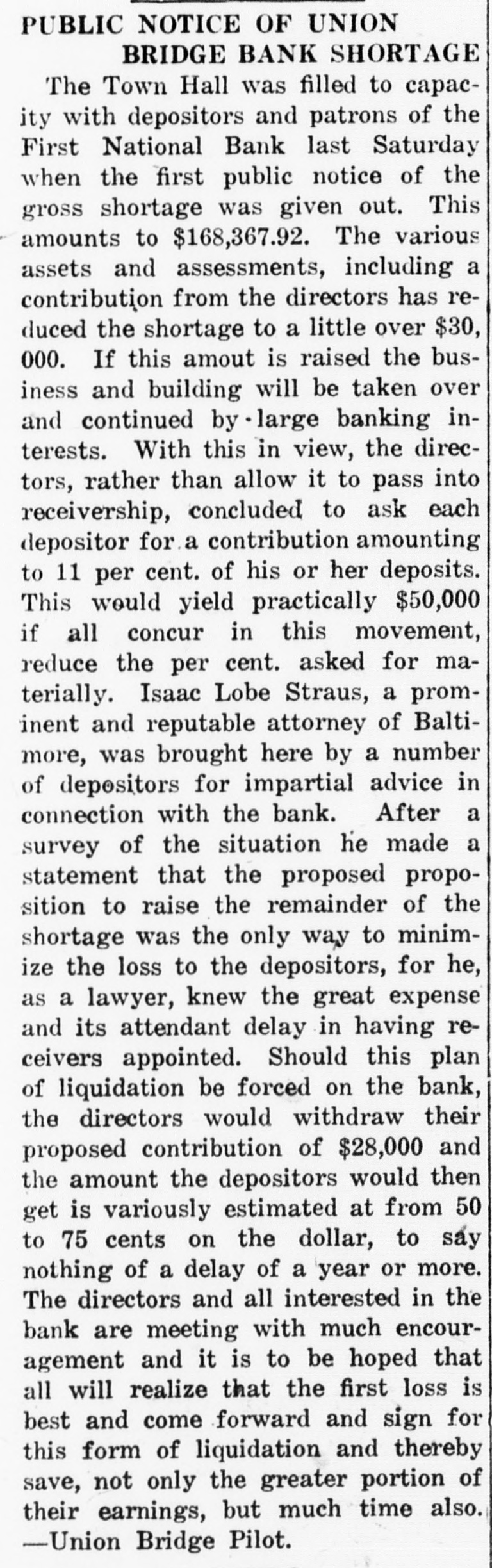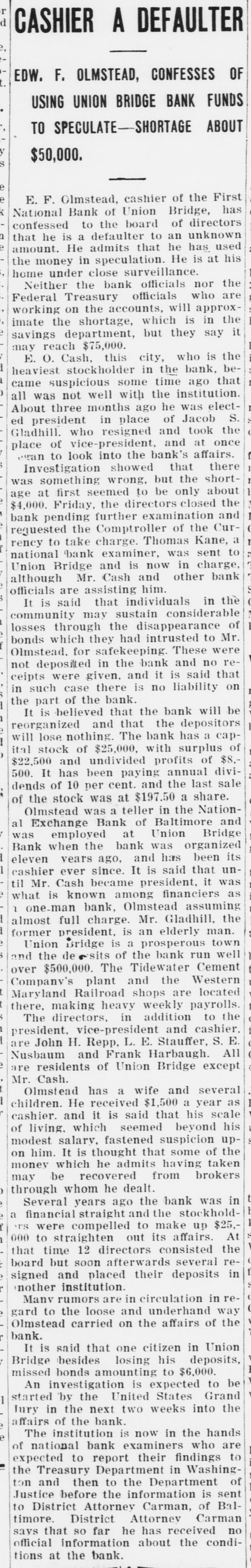 CASHIER A DEFAULTI EDW. F. OLMSTEAD, CONFESSES USING UNION BRIDGE BANK FUI TO SPECULATE-SHORTAGE ABC $50,000. E. F. Olmstead, cashier of the Fi National Bank of Union Bridge, I confessed to the board of direct that he is a defaulter to an unkno amount. He admits that he has us the money in speculation. He is at home under close surveillance. Neither the bank officials nor 1 Federal Treasury officials who : working on the accounts, will appre imate the shortage, which is in 1 savings department, but they say may reach $75,000. E. O. Cash, this city, who is 1 I heaviest stockholder in the bank, came suspicious some time ago tl all was not well with the instituti About three months ago he was ele ed president in place of Jacob Gladhill. who resigned and took 1 place of vice-president, and at or egan to look into the bank's affair Investigation showed that the was something wrong, but the sho age at first seemed to be only abo $4,000. Friday, the directors closed t bank pending further examination a requested the Comptroller of the Ct rency to take charge. Thomas Kane national bank examiner, was sent Union Bridge and is now in char although Mr. Cash and other ba officials are assisting him. It is said that individuals in t community may sustain consideral losses through the disappearance bonds which they had intrusted to I Olmstead. for safekeeping. These we not deposited in the bank and no ceipts were given, and it is said tl in such case there is no liability the part of the bank. It is believed that the bank will reorganized and that the deposito will lose nothing. The bank has a ca ital stock of $25,000, with surplus $22,500 and undivided profits of $ 500. It has been paying annual di dends of 10 per cent. and the last S of the stock was at $197.50 a share Olmstead was a teller in the Nati Bank of Peltimoro .