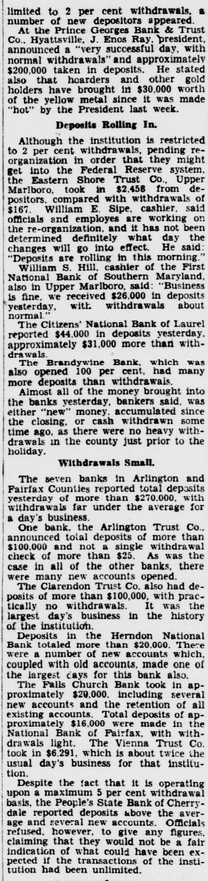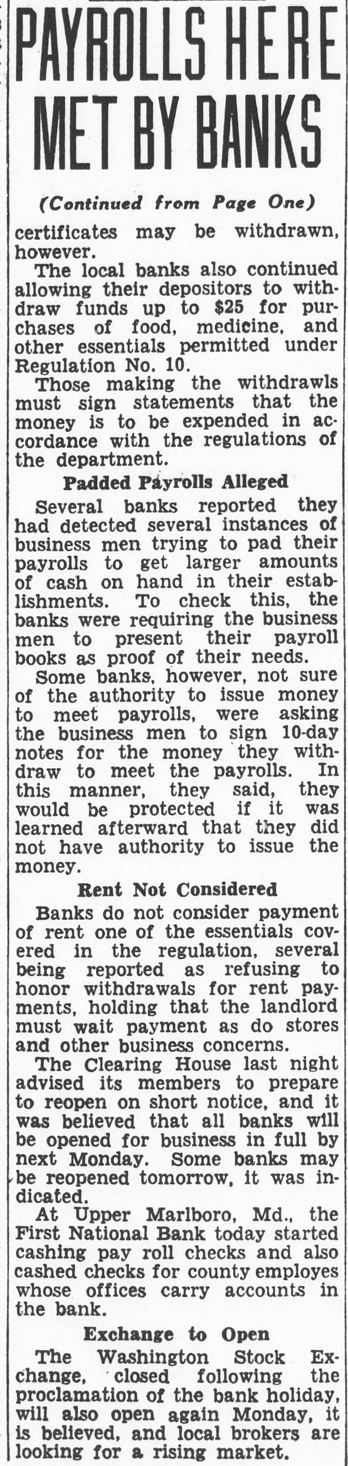 PAYROLLS HERE MET BY BANKS (Continued from Page One) certificates may be withdrawn, however. The local banks also continued allowing their depositors to withdraw funds up to $25 for purchases of food, medicine, and other essentials permitted under Regulation No. 10. Those making the withdrawls must sign statements that the money is to be expended in accordance with the regulations of the department. Padded Payrolls Alleged Several banks reported they had detected several instances of business men trying to pad their payrolls to get larger amounts of cash on hand in their establishments. To check this, the banks were requiring the business men to present their payroll books as proof of their needs. Some banks, however, not sure of the authority to issue money to meet payrolls, were asking the business men to sign 10-day notes for the money they withdraw to meet the payrolls. In this manner, they said, they would be protected if it was learned afterward that they did not have authority to issue the money. Rent Not Considered Banks do not consider payment of rent one of the essentials covered in the regulation, several being reported as refusing to honor withdrawals for rent payments, holding that the landlord must wait payment as do stores and other business concerns. The Clearing House last night advised its members to prepare to reopen on short notice, and it was believed that all banks will be opened for business in full by next Monday. Some banks may be reopened tomorrow, it was indicated. At Upper Marlboro, Md., the First National Bank today started cashing pay roll checks and also cashed checks for county employes whose offices carry accounts in the bank. Exchange to Open The Washington Stock Exchange, closed following the proclamation of the bank holiday, will also open again Monday, it is believed, and local brokers are looking for a rising market.
