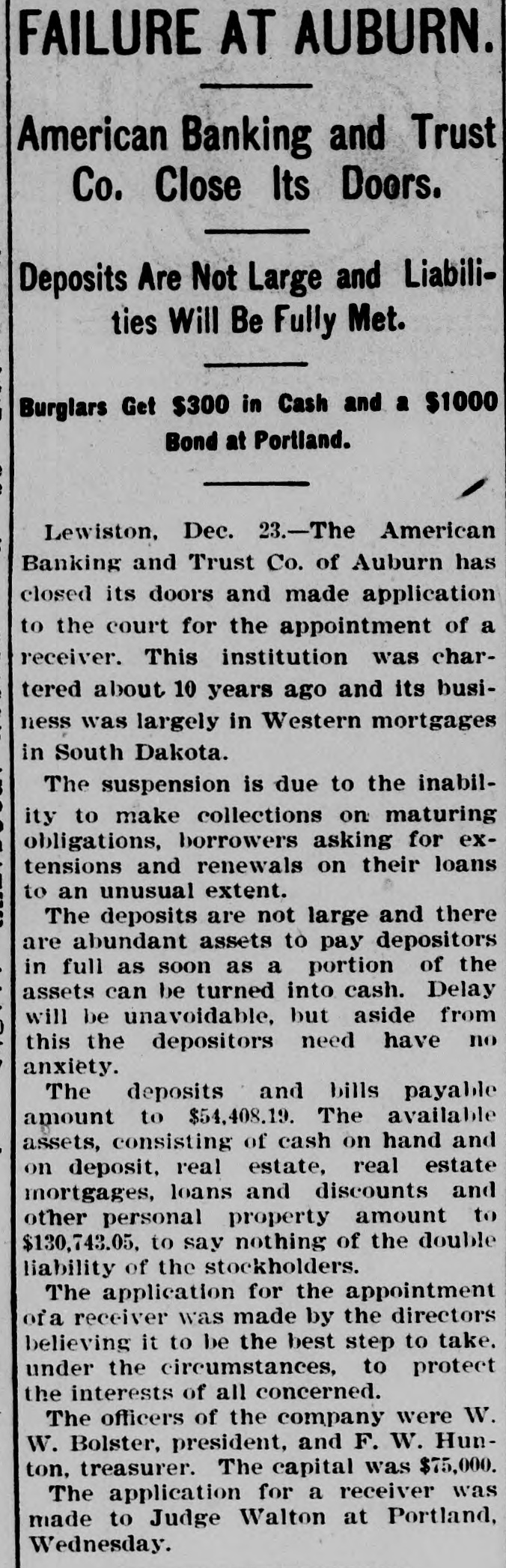 FAILURE AT AUBURN. American Banking and Trust Co. Close Its Doors. Deposits Are Not Large and Liabilities Will Be Fully Met. Burglars Get $300 in Cash and a $1000 Bond at Portland. Lewiston, Dec. 23.-The American Banking and Trust Co. of Auburn has closed its doors and made application to the court for the appointment of a receiver. This institution was chartered about 10 years ago and its business was largely in Western mortgages in South Dakota. The suspension is due to the inability to make collections on maturing obligations, borrowers asking for extensions and renewals on their loans to an unusual extent. The deposits are not large and there are abundant assets to pay depositors in full as soon as a portion of the assets can be turned into cash. Delay will be unavoidable, but aside from this the depositors need have no anxiety. The deposits and bills payable amount to $54,408.19. The available assets, consisting of cash on hand and on deposit, real estate, real estate mortgages, loans and discounts and other personal property amount to $130,743.05. to say nothing of the double liability of the stockholders. The application for the appointment ofa receiver was made by the directors believing it to be the best step to take. under the circumstances, to protect the interests of all concerned. The officers of the company were W. W. Bolster, president, and F. W. Hunton, treasurer. The capital was $75,000. The application for a receiver was made to Judge Walton at Portland, Wednesday.