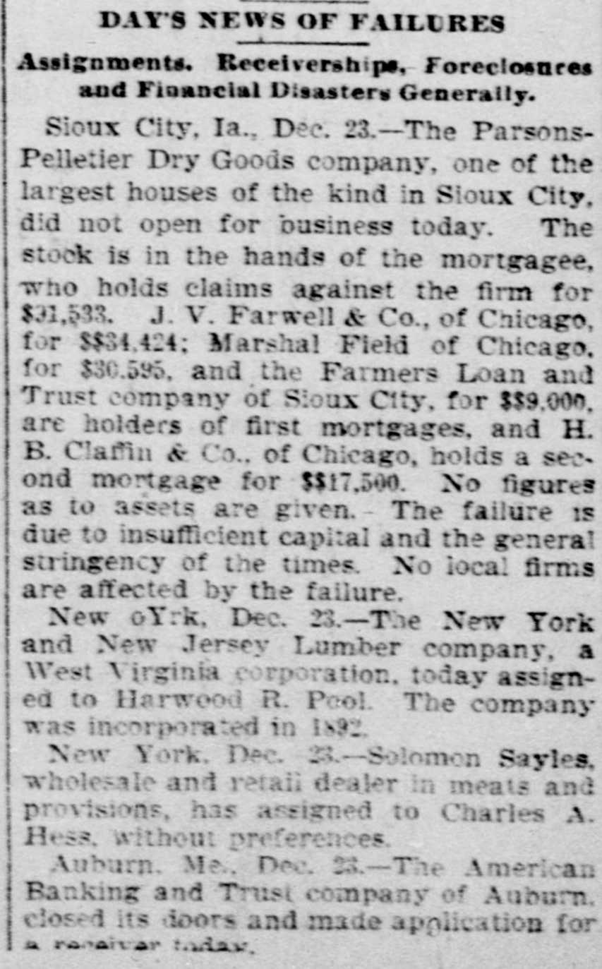 DAY'S NEWS OF FAILURES Assignments. Receiverships, Foreclosures and Financial Disasters Generally. Sioux City, Ia., Dec. 23.-The ParsonsPelletier Dry Goods company, one of the largest houses of the kind in Sioux City, did not open for business today. The stock is in the hands of the mortgagee, who holds claims against the firm for $31,533. J. V. Farwell & Co., of Chicago, for $$34,424; Marshal Field of Chicago, for $30,595. and the Farmers Loan and Trust company of Sloux City, for $$9,000, are holders of first mortgages, and H. B. Claffin & Co., of Chicago, holds a second mortgage for $$17,500. No figures as to assets are given. The failure IS due to insufficient capital and the general stringency of the times. No local firms are affected by the failure. New oYrk, Dec. 23.-The New York and New Jersey Lumber company, a West Virginia corporation. today assigned to Harwood R. Pool. The company was incorporated in 1892. New York, Dec. 23.-Solomon Sayles, wholesale and retail dealer in meats and provisions, has assigned to Charles A. Hess, without preferences. Auburn. Me., Dec. 23.-The American Banking and Trust company of Auburn. closed its doors and made application for a receiver todax.