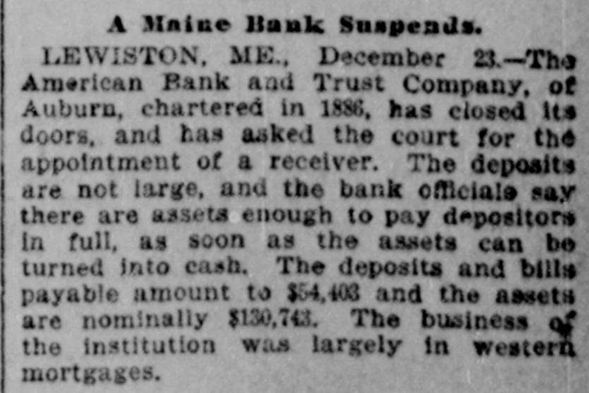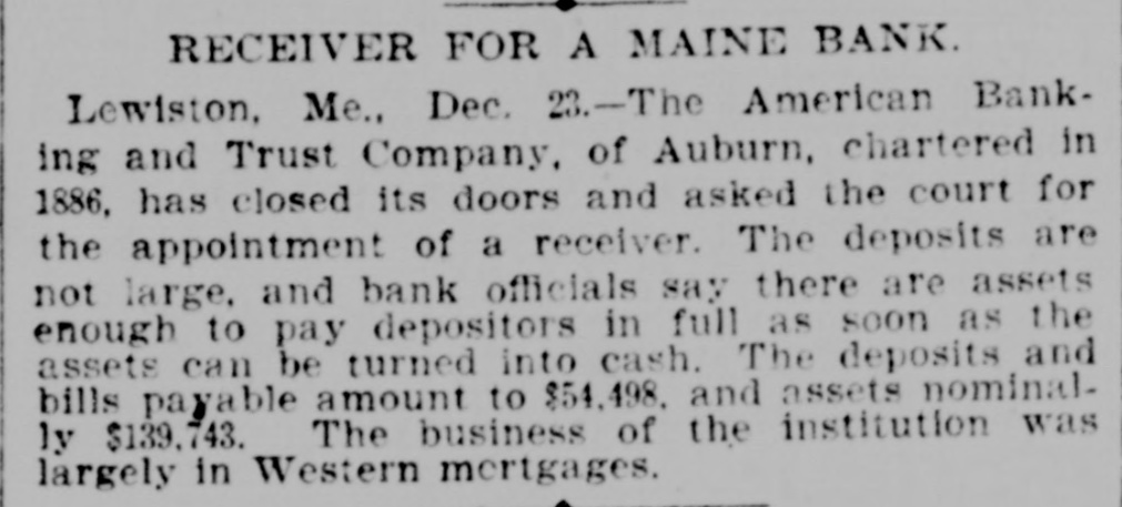 MAINE BANK FAILS. Directors Claim to Have Been Swamped by Western Investments. AUBURN, Me., Dec.:44.-The American Banking and Trust company of this city has closed its doors and made an application with Judge Walton of the supreme court for the appointment of a receiver. The directors issued a statement attributing their action to inability to realize on western investments sufficiently to meet the immediate demands of depositOPS. The bank holds mortgages on farm and city property in Nebraska, Mhinesota and South Dakota, and the lateness of the whe it crop, together with the holding by the farmers of their wheat crops for higher prices, has caused the stringency of money. The bank has a capital stock of $75,000. Its available assets are $130, 748.06 and its liabilities $54,408.1 19. The suspension caused considerable anxiety among depositors, and there is some talk of it possible run on other banks. The officers of the bank are: President, W. W. Bolster: treasurer, F. W. Hunton: directors, F. R. Conant, N. W. Harris, J. E. Briggs, Winthrop: II. H. Gurney, E. P. Wentworth, Deering.