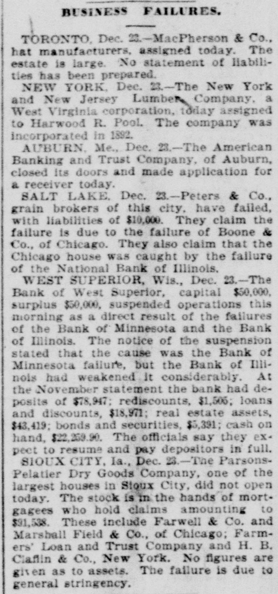 BUSINESS FAILURES. TORONTO, Dec. 23.-MacPherson & Co., hat manufacturers, assigned today. The estate is large. No statement of liabilities has been prepared. NEW YORK, Dec. 23.-The New York and New Jersey Lumber Company. a West Virginia corporation, today assigned to Harwood R. Pool. The company was incorporated in 1892. AUBURN, Me., Dec. 23.-The American Banking and Trust Company, of Auburn, closed its doors and made application for a receiver today. SALT LAKE, Dec. 23.-Peters & Co., grain brokers of this city, have failed, with liabilities of $10,000. They claim the failure is due to the failure of Boone & Co., of Chicago. They also claim that the Chicago house was caught by the failure of the National Bank of Illinois. WEST SUPERIOR, Wis., Dec. 23.-The Bank of West Superior, capital $50,000, surplus $50,000, suspended operations this morning as a direct result of the failures of the Bank of Minnesota and the Bank of Illinois. The notice of the suspension stated that the cause was the Bank of Minnesota failure, but the Bank of Illinois had weakened It considerably. At the November statement the bank had deposits of $78,947: rediscounts, $1,505; loans and discounts, $18,971; real estate assets, $43,419; bonds and securities, $5,391; cash on hand, $22,259.90. The officials say they expect to resume and pay depositors in full. SIOUX CITY, Ia., Dec. 23.-The ParsonsPelatier Dry Goods Company, one of the largest houses in Stoux City, did not open today. The stock is in the hands of mortgagees who hold claims amounting to $91,538. These include Farwell & Co. and Marshall Field & Co., of Chicago; Farmers' Loan and Trust Company and H. B. Claffin & Co., New York. No figures are given as to assets. The failure is due to general stringency.