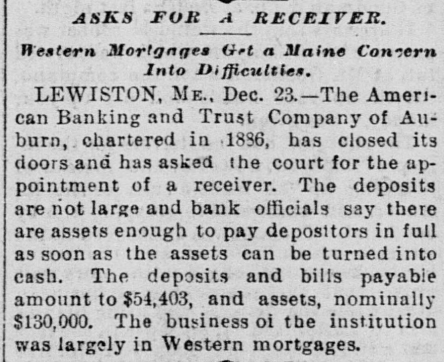 ASKS FOR A RECEIVER. Western Mortgages Get a Maine Concern Into Difficulties. LEWISTON, ME., Dec. 23.-The American Banking and Trust Company of Auburn, chartered in 1886, has closed its doors and has asked the court for the appointment of a receiver. The deposits are not large and bank officials say there are assets enough to pay depositors in full as soon as the assets can be turned into cash. The deposits and bills payable amount to $54,403, and assets, nominally $130,000. The business oi the institution was largely in Western mortgages.