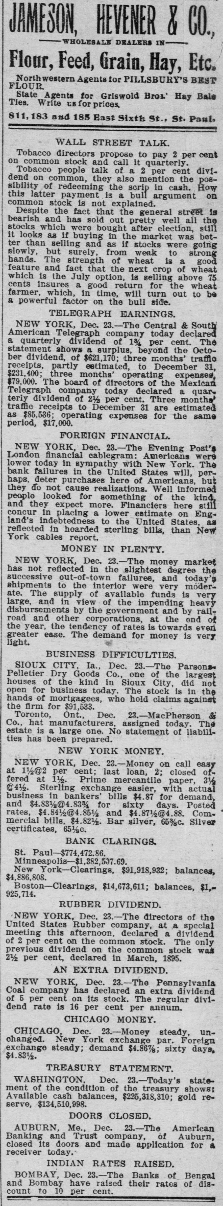 JAMESON, HEVENER & CO., WHOLESALE DEALERS Flour, Feed, Grain, Hay, Etc. Northwestern Agents for PILLSBURY'S BEST FLOUR. State Agents for Griswold Broa' Hay Bale Ties. Write us for prices, 811, 183 and 185 East Sixth St., St. Paul. WALL STREET TALK. Tobacco directors propose to pay 2 per cent on common stock and call it quarterly. Tobacco people talk of a 2 per cent dividend on common, they also mention the possibility of redeeming the scrip in cash. How this latter payment is a bull argument on common stock is not explained. Despite the fact that the general street is bearish and has sold out pretty well all the stocks which were bought after election, still it looks as if buying in the market was better than selling and as if stocks were going slowly, but surely, from weak to strong hands. The strength of wheat is a good feature and fact that the next crop of wheat which is the July option, is selling above 75 cents insures a good return for the wheat farmer, which, in time, will turn out to be a powerful factor on the bull side. TELEGRAPH EARNINGS. NEW YORK, Dec. 23.-The Central & South American Telegraph company today declared a quarterly dividend of 1% per cent. The statement shows a surplus, beyond the October dividend, of $621,170; three months' traffic receipts, partly estimated, to December 31, $231,400; three months' operating expenses, $79,000. The board of directors of the Mexican Telegraph company today declared a quarterly dividend of 2½ per cent. Three months' traffic receipts to December 31 are estimated as $85,536; operating expenses for the same period, $17,000. FOREIGN FINANCIAL. NEW YORK, Dec. 23.-The Evening Post's London financial cablegram: Americans were lower today in sympathy with New York. The bank failures in the United States will, perhaps, deter purchases here of Americans, but they do not cause realizations. Well informed people looked for something of the kind, and they expect more. Financiers here still concur in placing a lower estimate on England's indebtedness to the United States, as reflected in hoarded sterling bills, than New York cables report. MONEY IN PLENTY. NEW YORK, Dec. 23.-The money market has not reflected in the slightest degree the successive out-of-town failures, and today's shipments to the interior were very moderate. The supply of available funds is very large, and in view of the impending heavy disbursements by the government and by railroad and other corporations, at the end of the year, the tendency of rates is towards even greater ease. The demand for money is very light. BUSINESS DIFFICULTIES. SIOUX CITY, Ia., Dec. 23.-The Parsons. Pelletier Dry Goods Co., one of the largest houses of the kind in Sioux City, did not open for business today. The stock is in the hands of mortgagees, who hold claims against the firm for $91,533. Toronto, Ont., Dec. 23.-MacPherson & Co., hat manufacturers, assigned today. The estate is a large one. No statement of liabilities has been prepared. NEW YORK MONEY. NEW YORK, Dec. 23.-Money on call easy at 1½2 per cent; last loan, 2; closed offered at 1½. Prime mercantile paper, 3½ C4½. Sterling exchange easier, with actual business in bankers' bills $4.87 for demand, and $4.83/2@4.83% for sixty days. Posted rates, $4.84%@4.851/2 and $4.871/2@4.88. Commercial bills, $4.821/2. Bar silver, 65%c. Silver certificates, 651/gc. BANK CLARINGS. St. Paul-$774,472.86. Minneapolis-$1,382,507.69. New York-Clearings, $91,918,932; balances, $4,886,808. Boston-Clearings, $14,673,611; balances, $1,925,714. RUBBER DIVIDEND. NEW YORK, Dec. 23.-The directors of the United States Rubber company, at a special meeting this afternoon, declared a dividend of 2 per cent on the common stock. The only previous dividend on the common stock was 21/2 per cent, declared in March, 1895. AN EXTRA DIVIDEND. NEW YORK, Dec. 23.-The Pennsylvania Coal company has declared an extra dividend of 5 per cent on its stock. The regular dividend rate is 16 per cent per annum. CHICAGO MONEY. CHICAGO, Dec. 23.-Money steady, unchanged. New York exchange par. Foreign exchange steady; demand $4.867/3; sixty days. $4.831/2. TREASURY STATEMENT. WASHINGTON, Dec. 23.-Today's statement of the condition of the treasury shows: Available cash balances, $225,318,310; gold reserve, $134,510,998. DOORS CLOSED. AUBURN, Me., Dec. 23.-The American Banking and Trust company, of Auburn, closed its doors and made application for & receiver today. INDIAN RATES RAISED. BOMBAY, Dec. 23.-The Banks of Bengal and Bombay have raised their rates of discount to 10 per cent.
