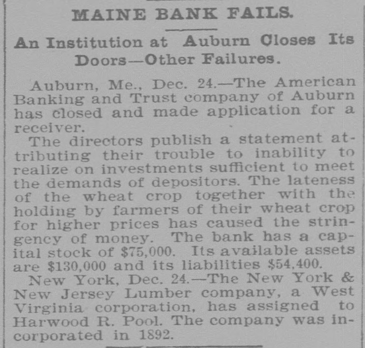 MAINE BANK FAILS. An Institution at Auburn Closes Its Doors-Other Failures. Auburn, Me., Dec. 24.-The American Banking and Trust company of Auburn has closed and made application for a receiver. The directors publish a statement attributing their trouble to inability to realize on investments sufficient to meet the demands of depositors. The lateness of the wheat crop together with the holding by farmers of their wheat crop for higher prices has caused the stringency of money. The bank has a capital stock of $75,000. Its available assets are $130,000 and its liabilities $54,400. New York, Dec. 24.-The New York & New Jersey Lumber company, a West Virginia corporation, has assigned to Harwood R. Pool. The company was incorporated in 1892.