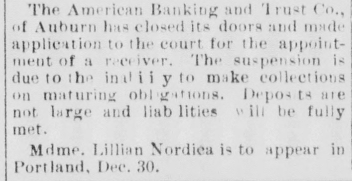 The American Banking and Trust Co., of Auburn has closed its doors and made application to the court for the appointment of a receiver. The suspension is due to the inalii y to make collections on maturing obligations. Deposits are not large and liab lities will be fully met. Mdme. Lillian Nordiea is to appear in Portland, Dec. 30.