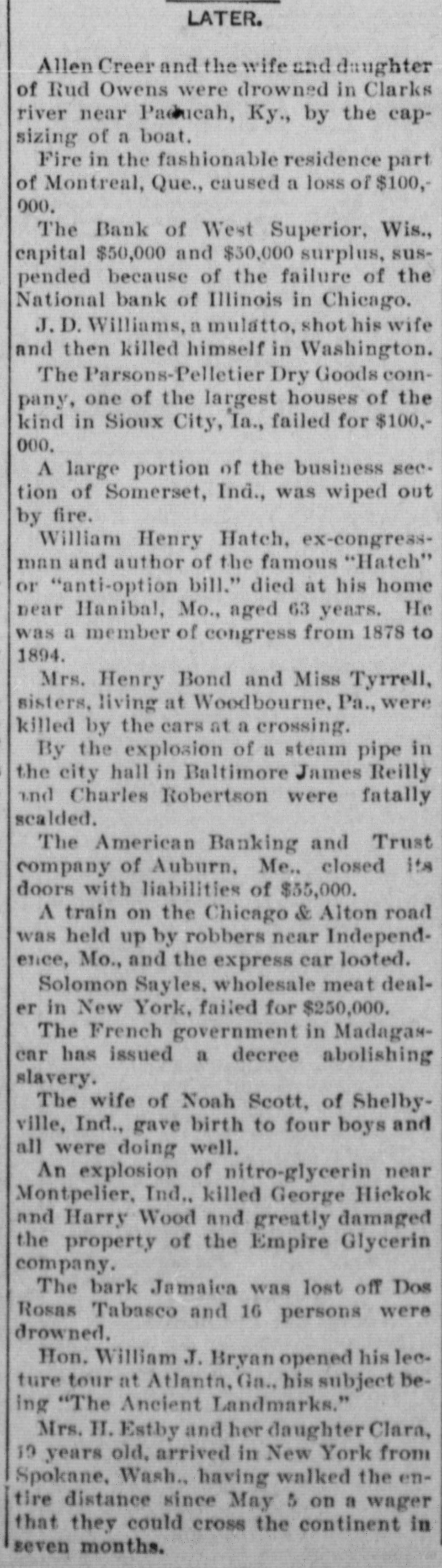 LATER. Allen Creer and the wife and daughter of Rud Owens were drowned in Clarks river near Paducah, Ky., by the capsizing of a boat. Fire in the fashionable residence part of Montreal, Que., caused a loss of $100,000. The Bank of West Superior, Wis., capital $50,000 and $50,000 surplus, suspended because of the failure of the National bank of Illinois in Chicago. J. D. Williams, a mulatto, shot his wife and then killed himself in Washington. The Parsons-Pelletier Dry Goods company, one of the largest houses of the kind in Sioux City, Ia., failed for $100,000. A large portion of the business section of Somerset, Ind., was wiped out by fire. William Henry Hatch, ex-congressman and author of the famous "Hatch" or "anti-option bill." died at his home near Hanibal, Mo., aged 63 years. He was a member of congress from 1878 to 1894. Mrs. Henry Bond and Miss Tyrrell, sisters, living at Woodbourne, Pa., were killed by the cars at a crossing. By the explosion of a steam pipe in the city hall in Baltimore James Reilly and Charles Robertson were fatally scalded. The American Banking and Trust company of Auburn, Me., closed its doors with liabilities of $55,000. A train on the Chicago & Alton road was held up by robbers near Independence, Mo., and the express car looted. Solomon Sayles, wholesale meat dealer in New York, failed for $250,000. The French government in Madagascar has issued a decree abolishing slavery. The wife of Noah Scott, of Shelbyville, Ind., gave birth to four boys and all were doing well. An explosion of nitro-glycerin near Montpelier, Ind., killed George Hickok and Harry Wood and greatly damaged the property of the Empire Glycerin company. The bark Jamaica was lost off Dos Rosas Tabasco and 16 persons were drowned. Hon. William J. Bryan opened his lecture tour at Atlanta, Ga., his subject being "The Ancient Landmarks." Mrs. H. Estby and her daughter Clara, 19 years old, arrived in New York from Spokane, Wash., having walked the entire distance since May 5 on a wager that they could cross the continent in seven months.