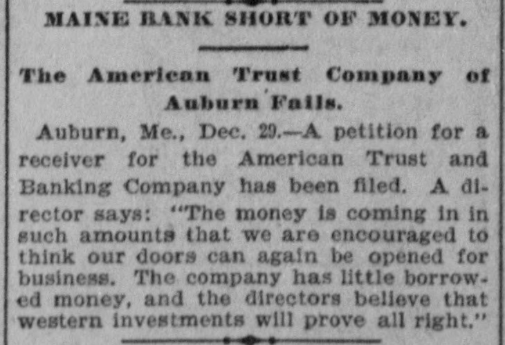 MAINE BANK SHORT OF MONEY. The American Trust Company of Auburn Fails. Auburn, Me., Dec. 29.-A petition for a receiver for the American Trust and Banking Company has been filed. A director says: "The money is coming in in such amounts that we are encouraged to think our doors can again be opened for business. The company has little borrowed money, and the directors believe that western investments will prove all right."