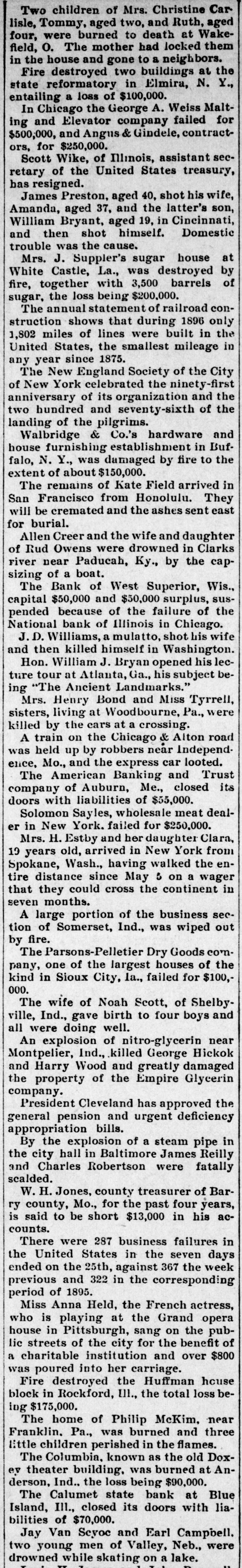 Two children of Mrs. Christine Carlisle, Tommy, aged two, and Ruth, aged four, were burned to death at Wakefield, O. The mother had locked them in the house and gone to a neighbors. Fire destroyed two buildings at the state reformatory in Elmira, N. Y., entailing a loss of $100,000. In Chicago the George A. Weiss Malting and Elevator company failed for $500,000, and Angus & Gindele, contractors, for $250,000. Scott Wike, of Illinois, assistant secretary of the United States treasury, has resigned. James Preston, aged 40, shot his wife, Amanda, aged 37, and the latter's son, William Bryant, aged 19, in Cincinnati, and then shot himself. Domestic trouble was the cause. Mrs. J. Suppler's sugar house at White Castle, La., was destroyed by fire, together with 3,500 barrels of sugar, the loss being $200,000. The annual statement of railroad construction shows that during 1896 only 1,802 miles of lines were built in the United States, the smallest mileage in any year since 1875. The New England Society of the City of New York celebrated the ninety-first anniversary of its organization and the two hundred and seventy-sixth of the landing of the pilgrims. Walbridge & Co.'s hardware and house furnishing establishment in Buffalo, N. Y., was damaged by fire to the extent of about $150,000. The remains of Kate Field arrived in San Francisco from Honolulu. They will be cremated and the ashes sent east for burial. Allen Creer and the wife and daughter of Rud Owens were drowned in Clarks river near Paducah, Ky., by the capsizing of a boat. The Bank of West Superior, Wis., capital $50,000 and $50,000 surplus, suspended because of the failure of the National bank of Illinois in Chicago. J. D. Williams, a mulatto, shot his wife and then killed himself in Washington. Hon. William J. Bryan opened his lecture tour at Atlanta, Ga., his subject being "The Ancient Landmarks." Mrs. Henry Bond and Miss Tyrrell, sisters, living at Woodbourne, Pa., were killed by the cars at a crossing. A train on the Chicago & Alton road was held up by robbers near Independence, Mo., and the express car looted. The American Banking and Trust company of Auburn, Me., closed its doors with liabilities of $55,000. Solomon Sayles, wholesale meat dealer in New York. failed for $250,000. Mrs. H. Estby and her daughter Clara, 19 years old, arrived in New York from Spokane, Wash., having walked the entire distance since May 5 on a wager that they could cross the continent in seven months. A large portion of the business section of Somerset, Ind., was wiped out by fire. The Parsons-Pelletier Dry Goods company, one of the largest houses of the kind in Sioux City, la., failed for $100,000. The wife of Noah Scott, of Shelbyville, Ind., gave birth to four boys and all were doing well. An explosion of nitro-glycerin near Montpelier, Ind., killed George Hickok and Harry Wood and greatly damaged the property of the Empire Glycerin company. President Cleveland has approved the general pension and urgent deficiency appropriation bills. By the explosion of a steam pipe in the city hall in Baltimore James Reilly and Charles Robertson were fatally scalded. W. H. Jones, county treasurer of BarΓy county, Mo., for the past four years, is said to be short $13,000 in his accounts. There were 287 business failures in the United States in the seven days ended on the 25th, against 367 the week previous and 322 in the corresponding period of 1895. Miss Anna Held, the French actress, who is playing at the Grand opera house in Pittsburgh, sang on the public streets of the city for the benefit of a charitable institution and over $800 was poured into her carriage. Fire destroyed the Huffman house block in Rockford, III., the total loss being $175,000. The home of Philip McKim, near Franklin. Pa., was burned and three little children perished in the flames. The Columbia, known as the old Doxey theater building, was burned at Anderson, Ind., the loss being $90,000. The Calumet state bank at Blue Island, III., closed its doors with liabilities of $70,000. Jay Van Seyoe and Earl Campbell. two young men of Valley, Neb., were drowned while skating on a lake.