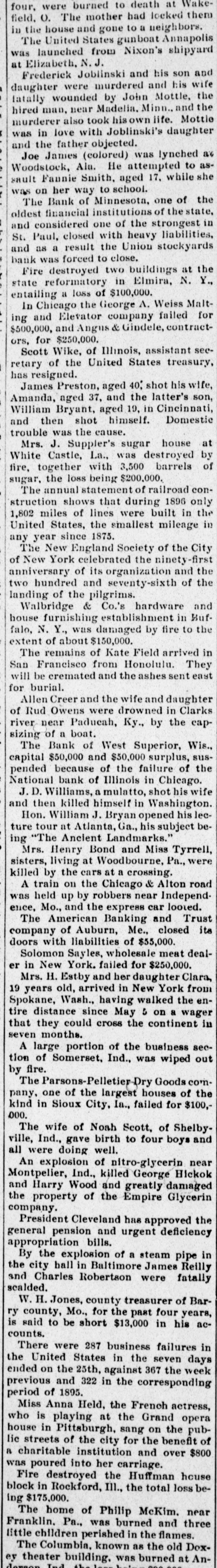 at Elizabeth, Frederick Joblinski and his son and daughter were murdered and his wife fatally wounded by John Mottle, the hired man, near Madelia. Minn., and the murderer also took his own life. Mottle was in love with Joblinski's daughter and the father objected. Joe James (colored) was lynched at Woodstock, Ala. He attempted to assault Fannie Smith, aged 17. while she was on her way to school. The Bank of Minnesota, one of the oldest financial institutions of the state, and considered one of the strongest in St. Paul, closed with heavy liabilities, and as a result the Union stockyards bank was forced to close. Fire destroyed two buildings at the state reformatory in Elmira, N. Y., entailing a loss of $100,000. In Chicago the George A. Weiss Malting and Elevator company failed for $500,000, and Angus & Gindele, contractors, for $250,000. Scott Wike, of Illinois, assistant secretary of the United States treasury, has resigned. James Preston, aged 40; shot his wife, Amanda, aged 37, and the latter's son, William Bryant, aged 19, in Cincinnati, and then shot himself. Domestic trouble was the cause. Mrs. J. Suppler's sugar house at White Castle, La., was destroyed by fire, together with 3,500 barrels of sugar, the loss being $200,000. The annual statement of railroad construction shows that during 1896 only 1,802 miles of lines were built in the United States, the smallest mileage in any year since 1875. The New England Society of the City of New York celebrated the ninety-first anniversary of its organization and the two hundred and seventy-sixth of the landing of the pilgrims. Walbridge & Co.'s hardware and house furnishing establishment in Buffalo, N. Y., was damaged by fire to the extent of about $150,000. The remains of Kate Field arrived in San Francisco from Honolulu. They will be cremated and the ashes sent east for burial. Allen Creer and the wife and daughter of Rud Owens were drowned in Clarks river near Paducah, Ky., by the capsizing of a boat. The Bank of West Superior, Wis., capital $50,000 and $50,000 surplus, suspended because of the failure of the National bank of Illinois in Chicago. J. D. Williams, a mulatto, shot his wife and then killed himself in Washington. Hon. William J. Bryan opened his lecture tour at Atlanta, Ga., his subject being "The Ancient Landmarks." Mrs. Henry Bond and Miss Tyrrell, sisters, living at Woodbourne, Pa., were killed by the cars at a crossing. A train on the Chicago & Alton road was held up by robbers near Independence, Mo., and the express car looted. The American Banking and Trust company of Auburn, Me., closed its doors with liabilities of $55,000. Solomon Sayles, wholesale meat dealer in New York. failed for $250,000. Mrs. H. Estby and her daughter Clara, 19 years old, arrived in New York from Spokane, Wash., having walked the entire distance since May 5 on a wager that they could cross the continent in seven months. A large portion of the business section of Somerset, Ind., was wiped out by fire. The Parsons-Pelletier-Dry Goods company, one of the largest houses of the kind in Sioux City, Ia., failed for $100,000. The wife of Noah Scott, of Shelbyville, Ind., gave birth to four boys and all were doing well. An explosion of nitro-glycerin near Montpelier, Ind., killed George Hickok and Harry Wood and greatly damaged the property of the Empire Glycerin company. President Cleveland has approved the general pension and urgent deficiency appropriation bills. By the explosion of a steam pipe in the city hall in Baltimore James Reilly and Charles Robertson were fatally scalded. W. H. Jones, county treasurer of Barry county, Mo., for the past four years, is said to be short $13,000 in his accounts. There were 287 business failures in the United States in the seven days ended on the 25th, against 367 the week previous and 322 in the corresponding period of 1895. Miss Anna Held, the French actress, who is playing at the Grand opera house in Pittsburgh, sang on the public streets of the city for the benefit of a charitable institution and over $800 was poured into her carriage. Fire destroyed the Huffman house block in Rockford, III., the total loss being $175,000. The DUV-