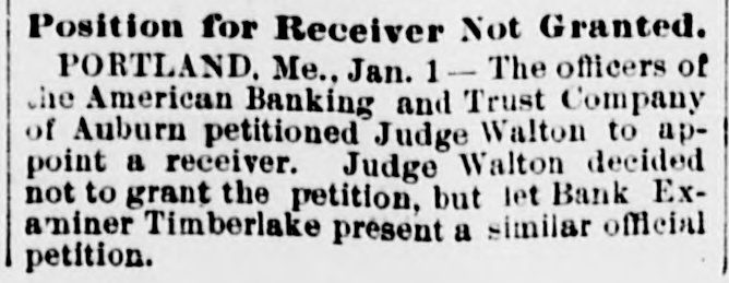 Position for Receiver Not Granted. PORTLAND. Me., Jan. 1- - The officers of the American Banking and Trust Company of Auburn petitioned Judge Walton to appoint a receiver. Judge Walton decided not to grant the petition, but let Bank Examiner Timberlake present a similar official petition.