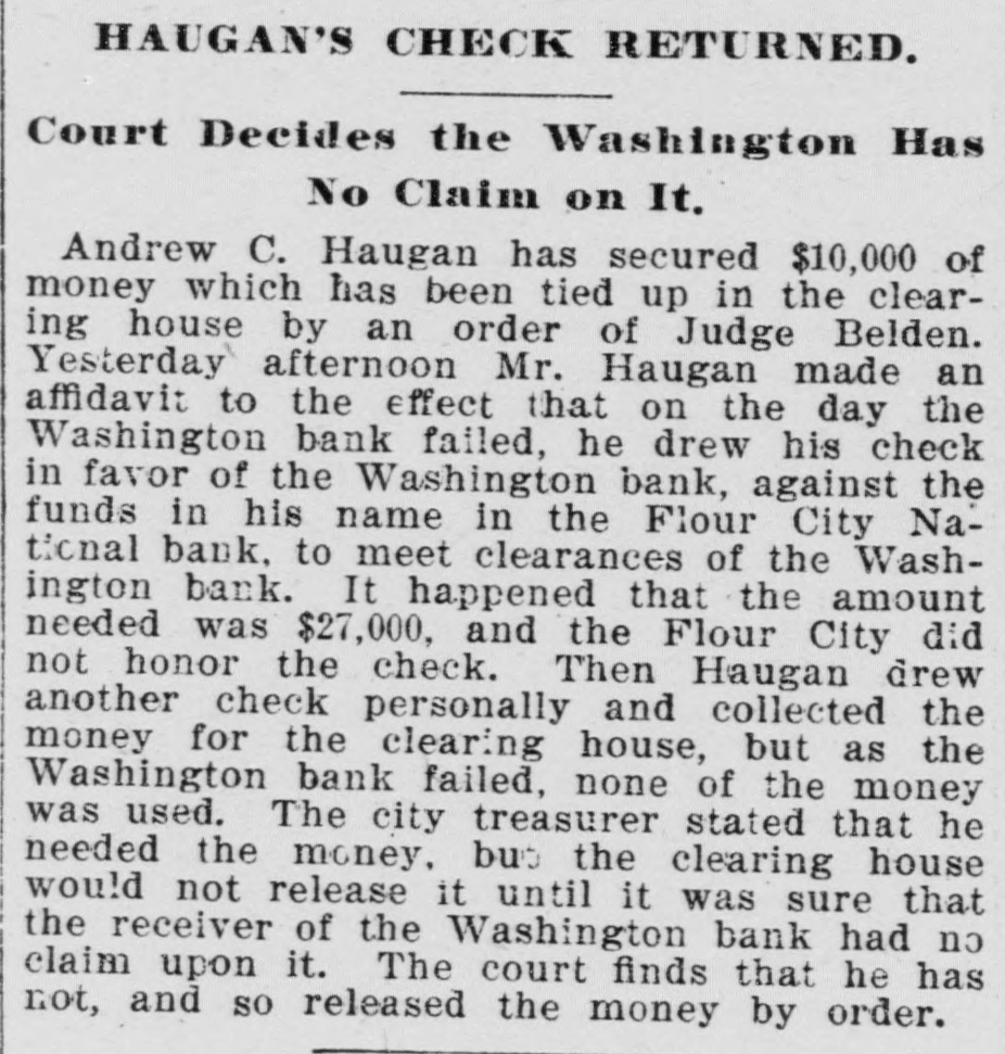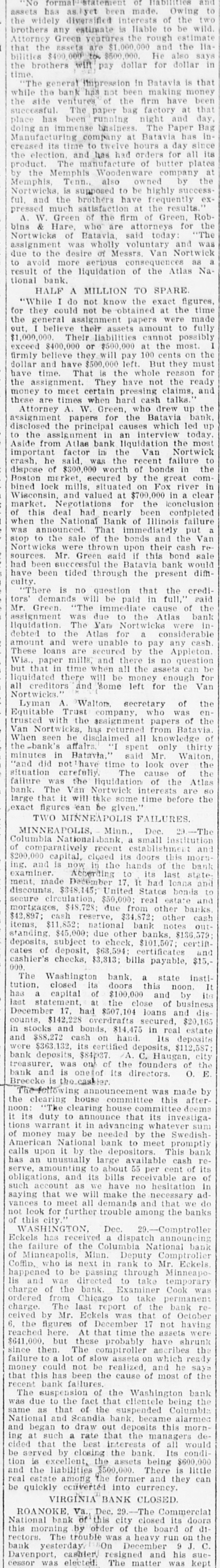 INABILITY TO REALIZE. Assets Were Slow and a Small Minneapolis Bank Closed. MINNEAPOLIS, Minn., December 20.The Columbia National Bank, a small institution of comparatively recent establishment and $200,000 capital, closed its doors this morning, and is now in the hands of the bank examiner. According to Its last statement, made December 17, it had loans and discounts of $348,145; United States bonds to secure circulation, $50,000; real estate and mortgages, $48,728; due from other banks, $42,807; cash reserve. $34,672; other cash items. $11,852; national bank notes outstanding, $45,000; due other banks. $136,579; deposits subject to check. $101,507; certificates of deposit, $63,594; certified and cashier's checks, $3.313; bills payable, $15,000. Cashier Jos. Bobleter said this morning: "We could have stood the pressure a little longer, but to protect the majority we closed this morning. We have $33,000 cash in the vault, and inside of sixty days expeet to have fully $100,000 more collected. Our total liabilities are only $247,000, and much of that, you understand, is not immediate. There is no doubt but what we will be able to make a full account with our depositors and a fair settlement with stockholders. "The recent withdrawals which caused the trouble were city and state funds, of which we had large deposits, and also by country correspondents. Of the city and state money. only about $11.200 remains in the bank. The majority of our individual depositors were business men." The officers are: Chas. Kittelson, president; H. Tuberson. vice president; Jos. Bobleter. cashier: J. C. Kittleson, assistant cashier. Among the directors are A. K. I. Teisberg and Charles Janson. The bank is in the immediate charge of George Coffin, deputy controller of the currency. He states that officers of the bank applied to the clearing house committee for assistance, but this body and the directors of the bank finally agreed that the best thing under the circumstances would be to close. "I believe." said Mr. Coffin. "that this action was anticipated by all parties interested, and the suspension will not cause any further trouble. All the national banks of this city are in a very strong condition financially, as we have satisfied ourselves by examination." Another Bank Closed. MINNEAPOLIS. Mirn., December 29.Washirgton bank, a state institution, closed its doors today. It had a capital of $100,000, and by its last statement at the close of business December 17, had $507,145 loans and discounts, $14,228 overdrafts secured. $20,165 in stocks and bonds, $14,475 in real estate, and $88,272 cash on hand. Its deposits were $346,153, its certified deposits $112,587. bank deposits $84,937. A. C. Haughan, city treasurer, was one of the founders of the bank and is one of its directors. O. E. Breecke is the cashier. Controller Eekels has received a dispatch announcing the failure of the Columbia National Bank of Minneapolis, Minn. Deputy Controller Coffin, who is next in rank to Mr. Eckels, happened to be passing through Minneapolis, and was directed to take temporary charge of the bank. Examiner Cook was ordered from Chicago to take permanent charge. The last report of the bank received by Mr. Eckels was that of October 6, the figures of December 17 not having reached here. At that time the assets were $641,000, but these probably have shrunk since then. The controller ascribed the failure to a lot of slow assets, on which ready money could not be realized, and he says this has been the cause of most of the recent bank failures.