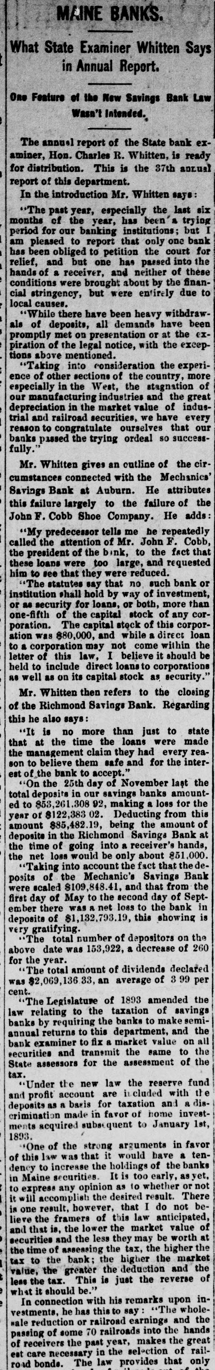 MAINE BANKS. What State Examiner Whitten Says in Annual Report. One Feature of the New Savings Bank Law Wasn't Intended. The annual report of the State bank examiner, Hon. Charles R. Whitten, is ready for distribution. This is the 37th annual report of this department. In the introduction Mr. Whitten says: "The past year, especially the last six months of the year, has been's trying period for our banking institutions; but I am pleased to report that only one bank has been obliged to petition the court for relief, and but one has passed into the hands of a receiver, and neither of these conditions were brought about by the financial stringency, but were entirely due to local causes. "While there have been heavy withdrawals of deposits, all demands have been promptly met on presentation or at the expiration of the legal notice, with the exceptions above mentioned. "Taking into consideration the experience of other sections of the country, more especially in the West, the stagnation of our manufacturing industries and the great depreciation in the market value of industrial and railroad securities, we have every reason to congratulate ourselves that our banks passed the trying ordeal so successfully." Mr. Whitten gives an outline of the circumstances connected with the Mechanics' Savings Bank at Auburn. He attributes this failure largely to the failure of the John F. Cobb Shoe Company. He adds: "My predecessor tells me be repeatedly called the attention of Mr. John F. Cobb, the president of the bink, to the fact that these loans were too large, and requested him to #ee that they were reduced. "The statutes say that no such bank or institution shall hold by way of investment, or as security for loans, or both, more than one-fifth of the capital stock of any corporation. The capital stock of this corporation was $80,000, and while a direct loan to a corporation may not come within the letter of this law, I believe it should be held to include direct loans to corporations as well as on its capital stock as security." Mr. Whitten then refers to the closing of the Richmond Savings Bank. Regarding this he also says: "It is no more than just to state that at the time the loans were made the management claim they had every reason to believe them safe and for the interest of the bank to accept." "On the 25th day of November last the total deposits in our savings banks amounted to $53,261.308 92, making a loss for the year of $122,383.02 Deducting from this amount $85,482.19, being the amount of deposits in the Richmond Savings Bank at the time of going into a receiver's hands, the net loss would be only about $51,000. "Taking into account the fact that the deposits of the Mechanic's Savings Bank were scaled $109,848.41, and that from the first day of May to the second day of September there was я net loss to the bank in deposits of $1,132,793.19, this showing is very gratifying. The total number of depositors on the above date was 153,922, a decrease of 260 for the year. The total amount of dividends declared was $2,069,136.33, an average of 3 99 per cent. "The Legislature of 1893 amended the law relating to the taxation of savings banks by requiring the banks to make semiannual returns to this department, and the bank examiner to fix a market value on all securities and transmit the same to the State assessors for the assessment of the tax. "Under the new law the reserve fund and profit account are included with the deposits as a basis for taxation and a discrimination made in favor of home investments acquired subsequent to January 1st, 1893. **One of the strong arguments in favor of this law was that it would have a tendency to increase the holdings of the banks in Maine securities. It is too early, as yet, to express any opinion as to whether or not it will accomplish the desired result. There is one result, however, that I do not believe the framers of this law anticipated, and that is, the lower the market value of securities and the less they may be worth at the time of assessing the tax, the higher the tax to the bank; the higher the market value, the greater the deduction and the less the tax. This is just the reverse of what it should be." In connection with his remarks upon investments, he has this to say "The wholesale reduction or railroad earnings and the passing of some 70 railroads into the hands of receivers the past year, makes the great