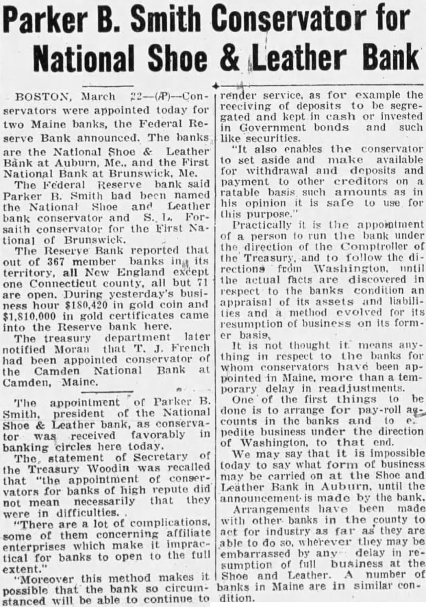 Parker B. Smith Conservator for National Shoe & Leather Bank BOSTON, March servators were appointed today for two Maine banks, the Federal Reserve Bank announced. The banks are the National Shoe Leather Bank at Auburn, the First National Bank Me. The Federal Reserve bank said Parker Smith bad been named the National Shoe and Leather bank conservator and conservator the First Na. tional The Bank reported that 367 member banks ing. its territory, all New England except one Connecticut county, all but are open. During yesterday's busiin gold coin and in gold into the bank here. department later notified Moran French had been the Camden National Bank Camden, of Parker B. The appointment president the National Shoe Leather conserva received favorably in banking circles here today. Secretary of The, statement the Treasury Woodin was recalled that "the appointment conservators for banks repute did that they not mean difficulties. "There lot of complications, some them concerning affiliate enterprises which make impracbanks to the full tical for to open Moreover this method makes that the bank circumpossible be able to continue to stanced will render as for example the segregated and in Government bonds and such like securities. also enables the conservator to set aside and available for withdrawal and deposits payment to other creditors ratable amounts his opinion is safe to for purpose Practically the appointment person the bank under direction the the Treasury and to follow the the actual in respect the banks condition appraisal liabilities and for resumption of on its formbasis, not thought means thing in respect the banks for whom been pointed Maine, than temporary One first things done is to arrange for pay-roll counts in the banks pedite business under the direction of Washington, to that end. We may is impossible today business be carried the Shoe and Leather Bank until the announcement made by the bank. Arrangements have been made other banks in the county to act for industry as far as they are able to do wherever they may be embarrassed by delay in sumption business the Shoe and Leather number banks in Maine are in similar condition.