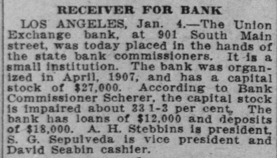 RECEIVER FOR BANK LOS ANGELES, Jan. 4.-The Union Exchange bank, at 901 South Main street, was today placed in the hands of the state bank commissioners. It is a small institution. The bank was organized in April, 1907, and has a capital stock of $27,000. According to Bank Commissioner Scherer, the capital stock is impaired about 33 1-3 per cent, The bank has loans of $12,000 and deposits of $18,000. A. H. Stebbins is president, S. G. Sepulveda is vice president and David Seabin cashier.
