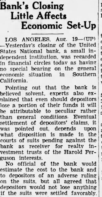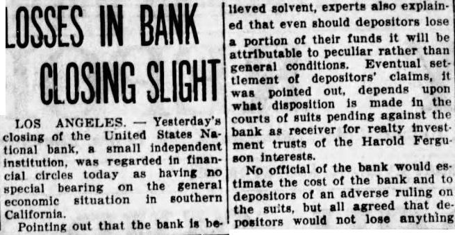 LOS Aug -Yesterdav's closing of the United States National bank, small independent was regarded in financial circles todav as having no special bearing on the general economic situation in Southern California. Pointing out that the bank believed solvent. experts also plained that should depositors lose portion of their funds will attributable to peculiar rather than general conditions Eventual settlement depositors' claims, was pointed depends upon what disposition made in courts of suits pending against the bank receiver for realty investment trusts of the Harold Ferguson interests. No official of the bank would estimate the cost to the bank and to depositors of an adverse ruling on the suits. but all agreed that would lose anything the suits were settled favorably.