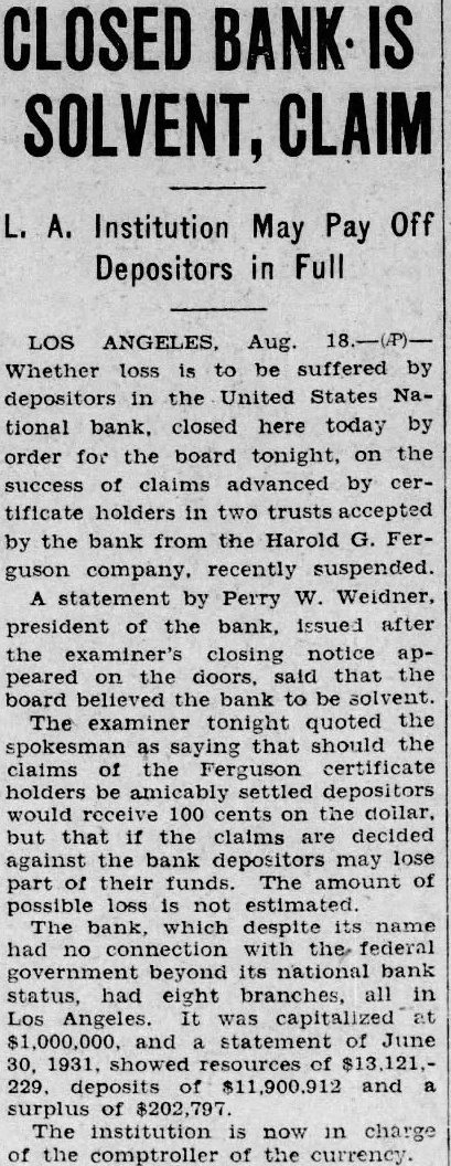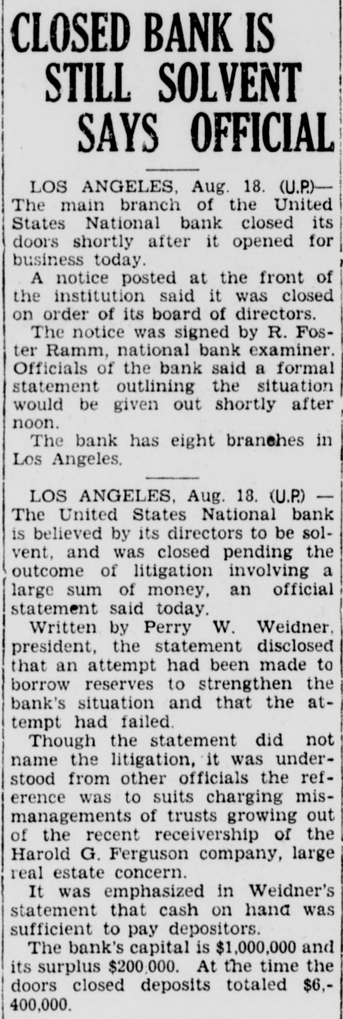 CLOSED BANK IS STILL SOLVENT SAYS OFFICIAL LOS ANGELES, Aug. 18. (U.P.)The main branch of the United States National bank closed its doors shortly after it opened for business today. A notice posted at the front of the institution said it was closed on order of its board of directors. The notice was signed by R. Foster Ramm, national bank examiner. Officials of the bank said a formal statement outlining the situation would be given out shortly after noon. The bank has eight branches in Los Angeles. LOS ANGELES, Aug. 18. (U.P.) The United States National bank is believed by its directors to be solvent, and was closed pending the outcome of litigation involving a large sum of money, an official statement said today. Written by Perry W. Weidner, president, the statement disclosed that an attempt had been made to borrow reserves to strengthen the bank's situation and that the attempt had failed. Though the statement did not name the litigation, it was understood from other officials the reference was to suits charging mismanagements of trusts growing out of the recent receivership of the Harold G. Ferguson company, large real estate concern. It was emphasized in Weidner's statement that cash on hand was sufficient to pay depositors. The bank's capital is $1,000,000 and its surplus $200,000. At the time the doors closed deposits totaled $6,400,000.