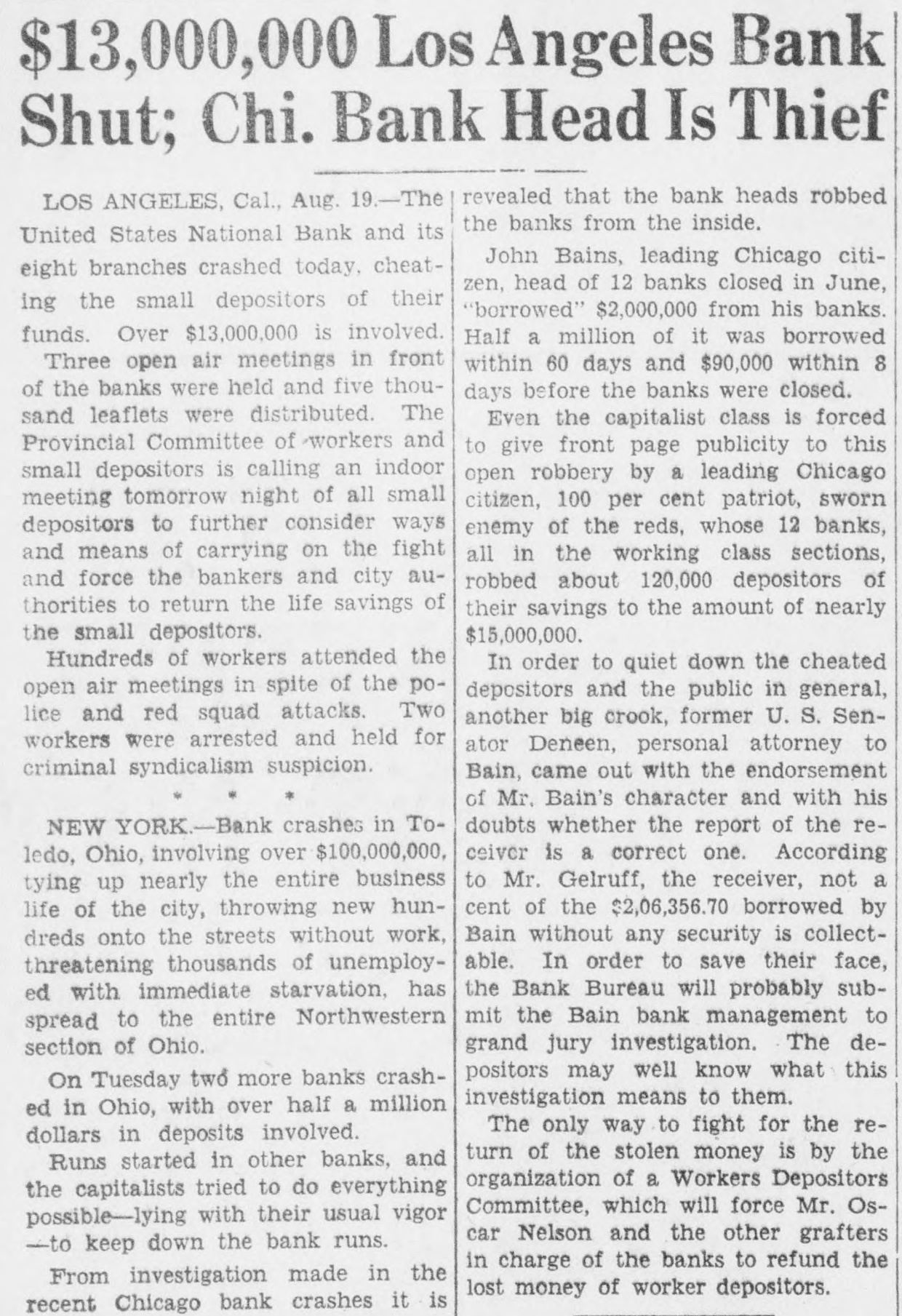 Even the capitalist class is forced to give front page publicity to this open robbery by a leading Chicago citizen, 100 per cent patriot, sworn enemy of the reds, whose 12 banks, all in the working class sections, robbed about 120,000 depositors of their savings to the amount of nearly $15,000,000.