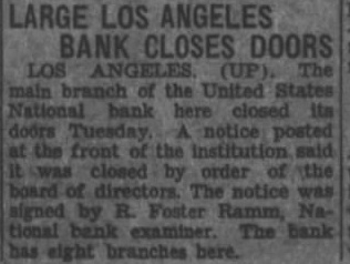 LOS ANGELES BANK CLOSES