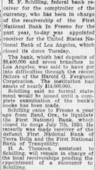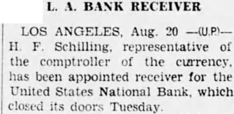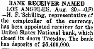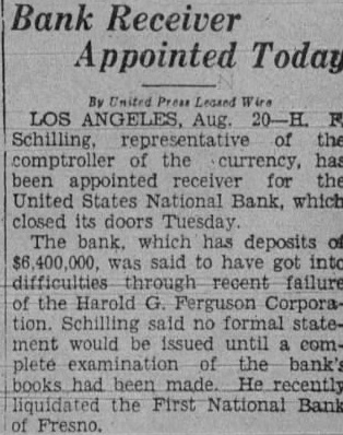 LOS ANGELES, Aug. Schilling, representative the comptroller the has been appointed receiver United States National Bank, which closed its doors Tuesday The which has deposits of said to have difficulties through recent failure the Harold Ferguson Corporation. Schilling said formal statement would issued until complete examination the bank's books made. He liquidated the First National Bank Fresno.