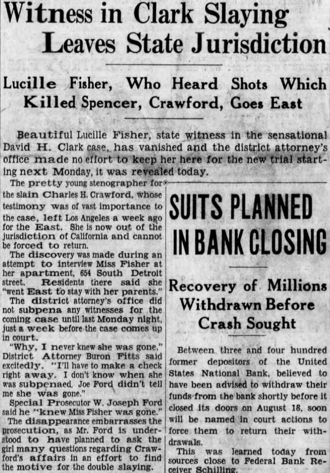 Beautiful Lucille Fisher, state witness in the sensational David H. Clark case, has vanished and the district attorney's office made no effort to keep her here for the new trial starting next Monday, it was revealed today. The pretty young stenographer for the slain Charles H. Crawford, whose testimony was of vast importance to SUITS PLANNED the case, left Los Angeles a week ago for the East. She now out of the jurisdiction of California and cannot IN BANK CLOSING be forced to return. The discovery was made during an attempt to interview Miss Fisher at her apartment, 654 South Detroit street. Residents there said she Recovery of Millions "went East to stay with her parents.' The district attorney's office did Withdrawn Before not subpena any witnesses for the coming case until last Monday night, Crash Sought just week before the case comes up in court. 'Why, I never knew she was gone,' Between three and four hundred District Attorney Buron Fitts said former depositors of the United excitedly. "I'll have to make a check States National Bank, believed to right away. don't know when she was subpenaed. Joe Ford didn't tell have been advised to withdraw their me she was gone." funds from the bank shortly before it Special Prosecutor W. Joseph Ford closed its doors on August 18. soon said he "knew Miss Fisher was gone. will be named in court actions to The embarrasses the prosecution, as Mr. Ford is under- force them to return their withstood to have planned to ask the drawals. girl many questions regarding CrawThis was learned today from ford's affairs in an effort to find sources close Federal Bank Rethe motive for the double slaying. ceiver