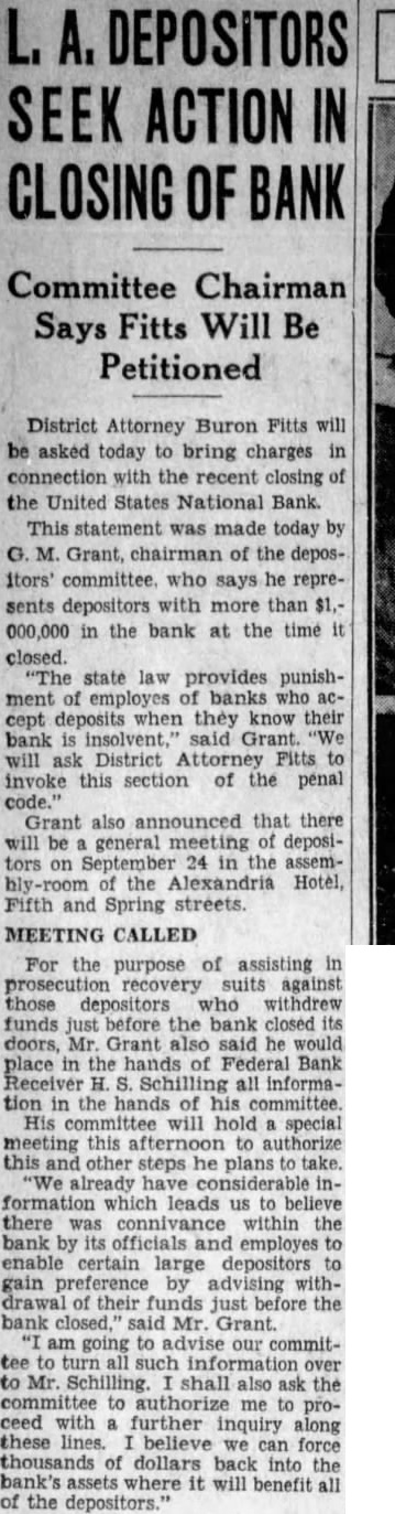 District Attorney Buron Fitts will be asked today to bring charges in connection with the recent closing of the United States National Bank. This statement was made today by G. M. Grant, chairman of the depositors' committee. who says he represents depositors with more than $1,000,000 in the bank at the time it closed. "The state law provides punishment of employes of banks who accept deposits when they know their bank is insolvent.' said Grant. "We will ask District Attorney Fitts to invoke this section of the penal code." Grant also announced that there will be a general meeting of depositors on September 24 in the assemhly-room of the Alexandria Hotel, Fifth and Spring streets. MEETING CALLED