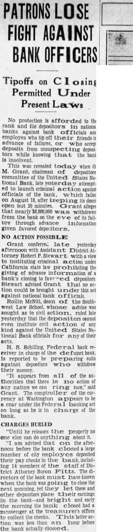"Until he releases the property no one else can anything about it. "I am advised that on the afternoon before the bank closed large number of city employes deposited their pay checks in the bank, including 14 members of the staff District Attorney Buron Fitts. The directors of the bank must have known when the bank was going to close the next morning, yet they let these and other depositors place their earnings in the bank-and bright and early the morning the bank closed had messenger at the treasurer's offices to collect the checks. This latter tion was less than an hour before the bank actually closed.