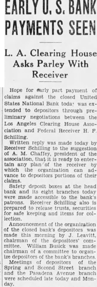 Hope for early part payment of claims against the closed United States National Bank toda: was extended to depositors through preliminary negotiations between the Los Angeles Clearing House Association and Federal Receiver H. F Schilling. Written reply was made today by Receiver Schilling to the suggestion of A. M. Chaffey, president of the association, that it is ready to entertain any plan of the receiver by which the organization can advance to depositors portions of their claims. Safety deposit boxes at the head bank and its eight branches today were made accessible to the bank's patrons. Receiver Schilling also is prepared to release trusts, securities for safe keeping and items for collection. Announcement of the organization of the closed bank's depositors was made this morning by Leavitt. chairman of the depositors' committee. William Busick was made chairman of a committee to organize depositors of the bank's branches. Meetings of depositors of the Spring and Second Street branch and the Pasadena Avenue branch were scheduled late today and Monday.