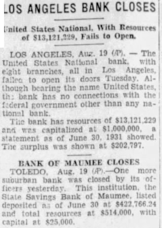 LOS United States National eight branches, Los falled to its Tuesday though the bank federal government other than any The resources of bank has and as of 30. 1931 showed. The surplus was shown at $202,797.