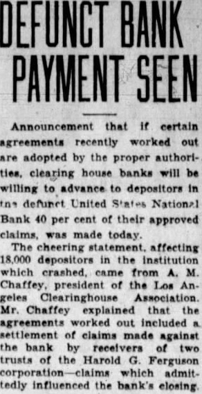 Announcement that if certain agreements recently worked out are adopted by the proper authorities, clearing house banks will be willing to advance to depositors in tns defunct United States National Bank 40 per cent of their approved claims, was made today. The cheering affecting 18,000 depositors in the institution which crashed, came from A. M. Chaffey, president of the Los Angeles Clearinghouse Association Mr. Chaffey explained that the agreements worked out included settlement of claims made against the bank by receivers of two trusts of the Harold G. Ferguson corporation claims which admittedly influenced the bank's closing