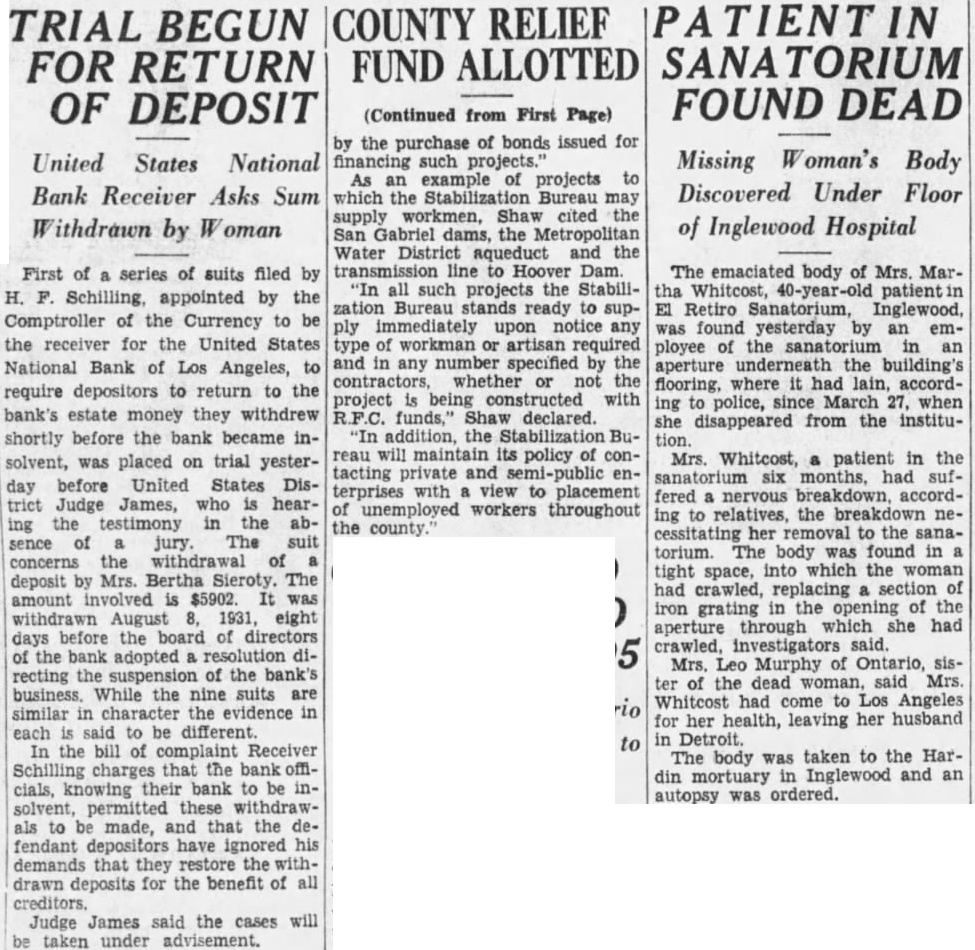 The emaciated body of Mrs. Martha Whitcost, patient Retiro Sanatorium, Inglewood, was found yesterday by an employee of the sanatorium in an aperture underneath the building's flooring, where had lain, according to police, since March 27, when she disappeared from the instituMrs. Whitcost, patient in the sanatorium six months, had suffered nervous breakdown, according to relatives, the breakdown necessitating her removal to the sanatorium. The body was found in tight space, into which the woman had crawled, replacing section of iron grating in the opening of the aperture through which she had crawled, investigators said. Mrs. Murphy of Ontario, sisof the dead woman, said Mrs. Whitcost had come to Los Angeles her health, leaving her husband in Detroit. The body was taken to the Hardin mortuary in Inglewood and an autopsy was ordered.