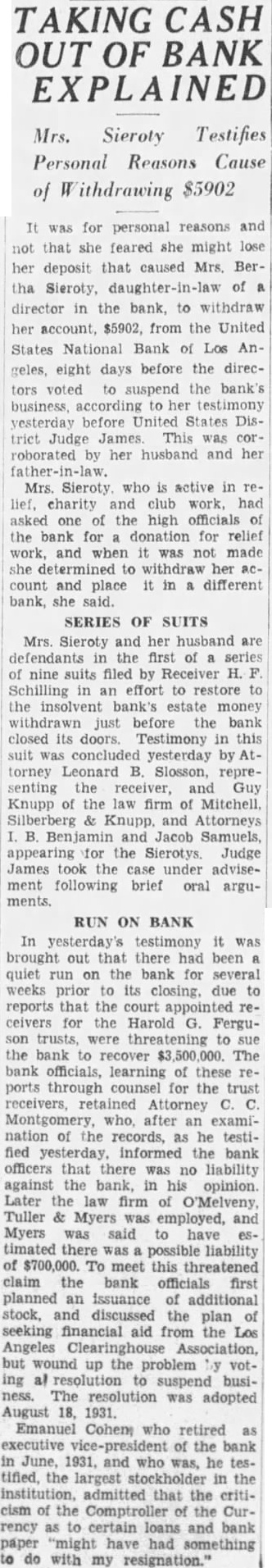 SERIES OF SUITS Mrs. Sieroty and her husband are defendants in the first of a series of nine suits filed by Receiver H. F. Schilling in an effort to restore to the insolvent bank's estate money withdrawn just before the bank closed its doors. Testimony in this suit was concluded yesterday by Attorney Leonard B. Slosson, representing the receiver, and Guy Knupp of the law firm of Mitchell. Silberberg & Knupp. and Attorneys I. B. Benjamin and Jacob Samuels, appearing for the Sierotys Judge James took the case under advisement following brief oral arguments.